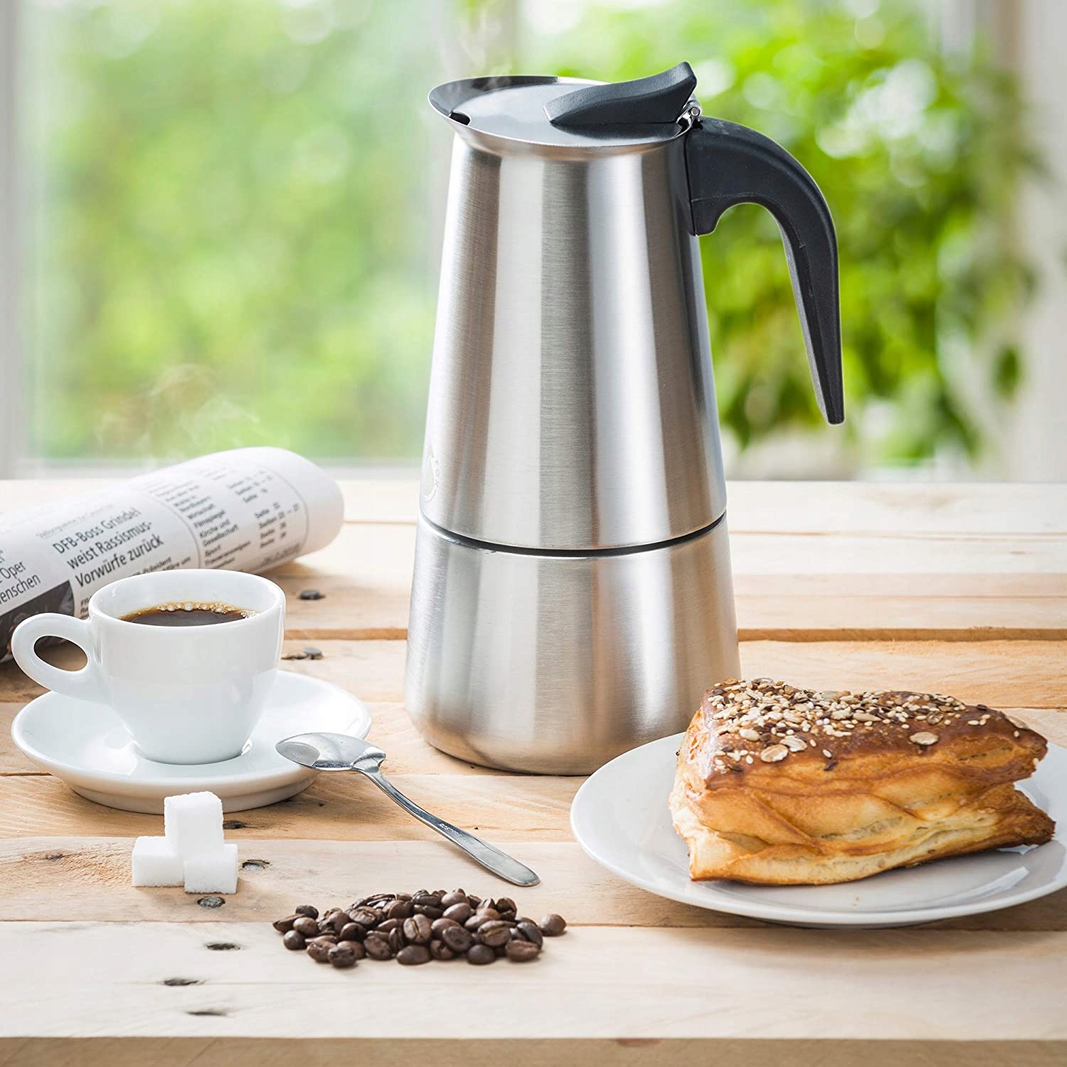 Кофеварка полностью изготовлена из благородной нержавеющей стали. Подходит для газовых и электрических плит.