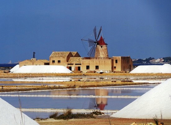 Каждая весенняя соль заполнена морской водой, которая остается до испарения в жаре сицилийского лета Солнце и сильных африканских ветров .
