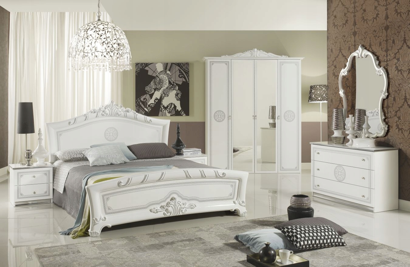полностью белая лакированная, украшенная шелково-жемчужной шелкографией, фурнитура из серебра, кровать, украшенная кристаллами по узору