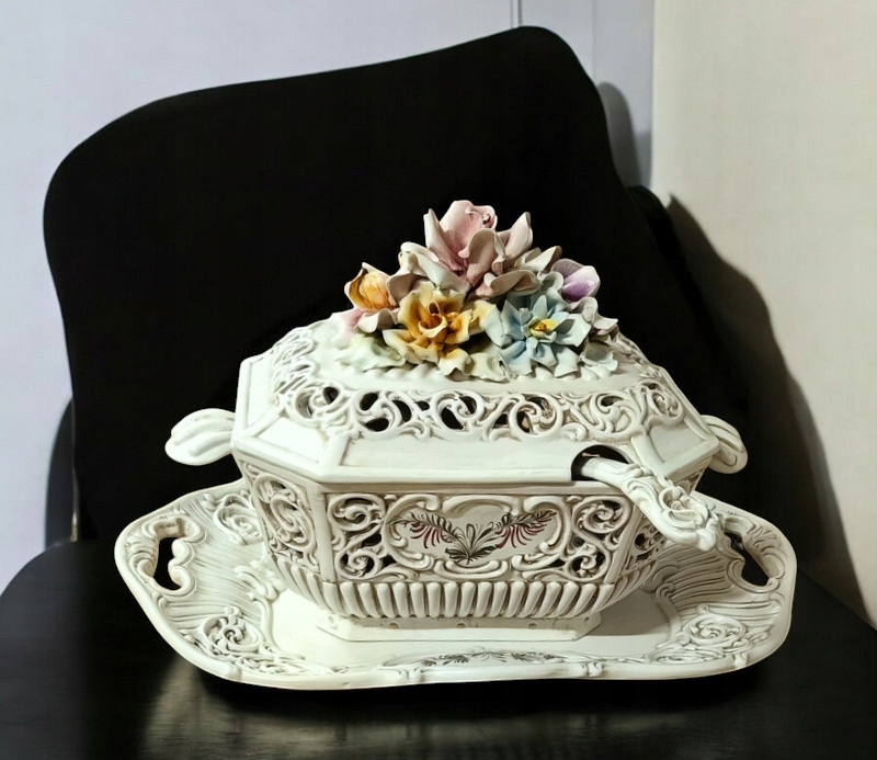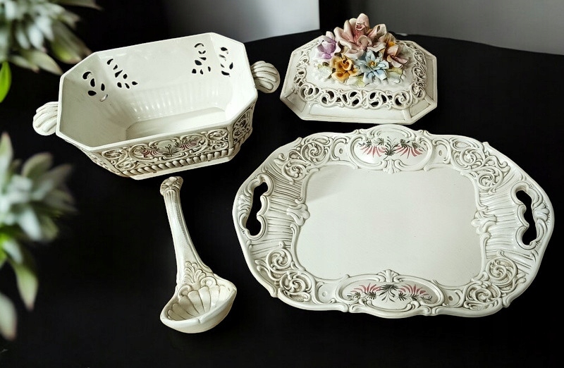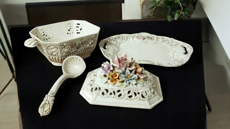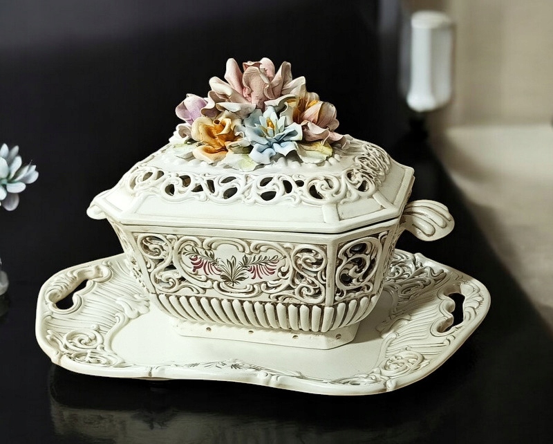 Бывший в употреблении сосуд из керамики итальянской компании Bassano, украшенный цветочными мотивами. Бонбоньерка выполнена с вниманием к деталям. Несмотря на возраст (1970-1980-е годы), состояние очень хорошее.