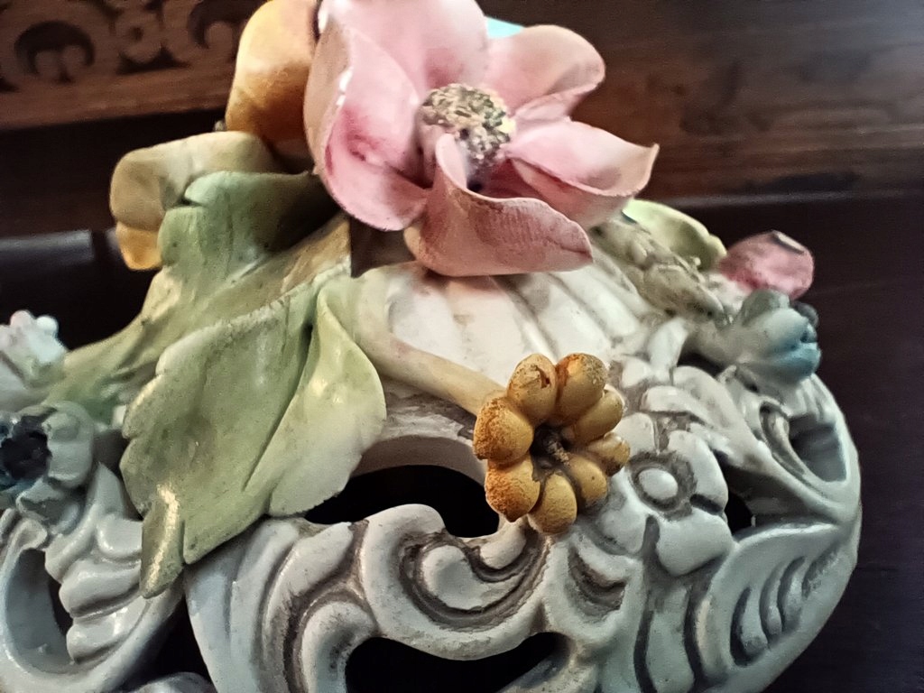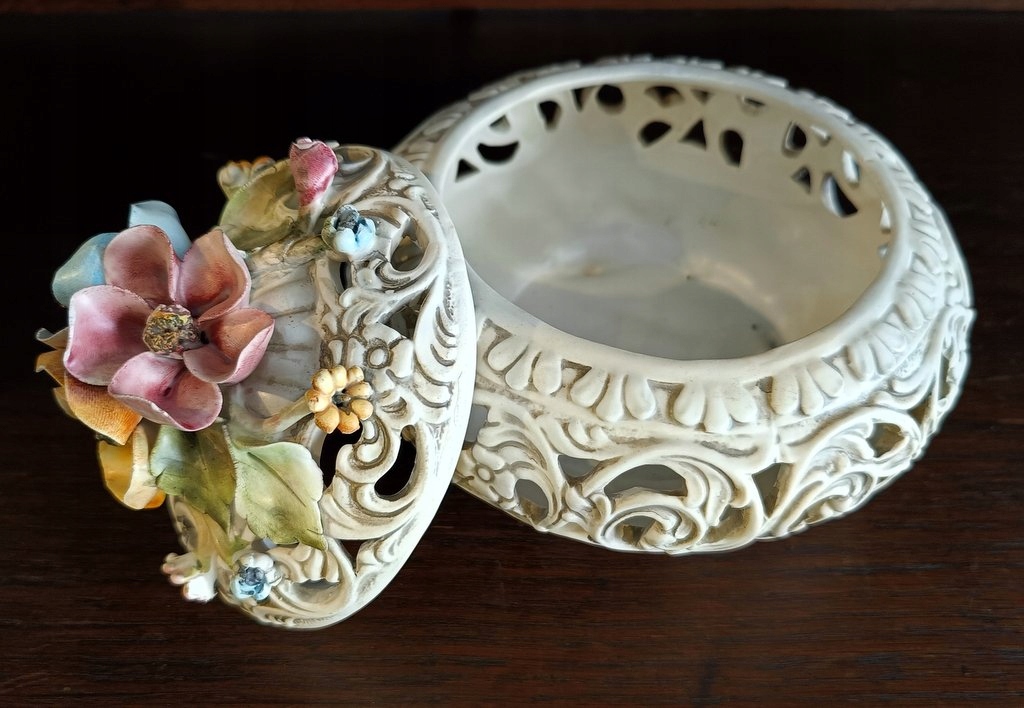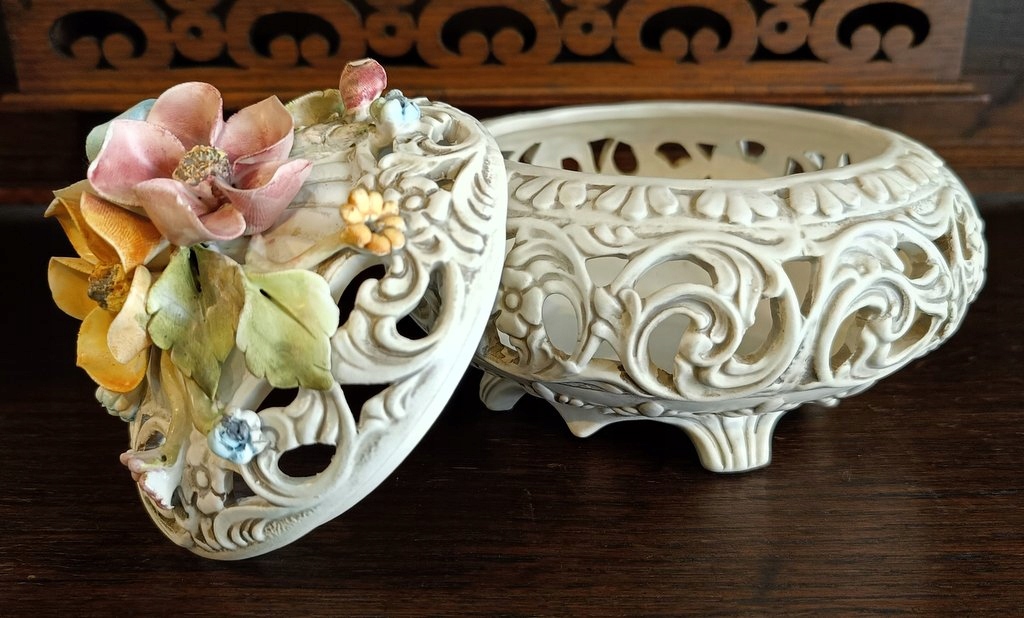 Использованная вещь, изготовленная из керамики по старинному дизайну и украшенная красивыми мотивами в виде разноцветных роз. Бонбоньерка сделана с вниманием к мельчайшим деталям. Несмотря на возраст (1970-1980-е годы), состояние очень хорошее.