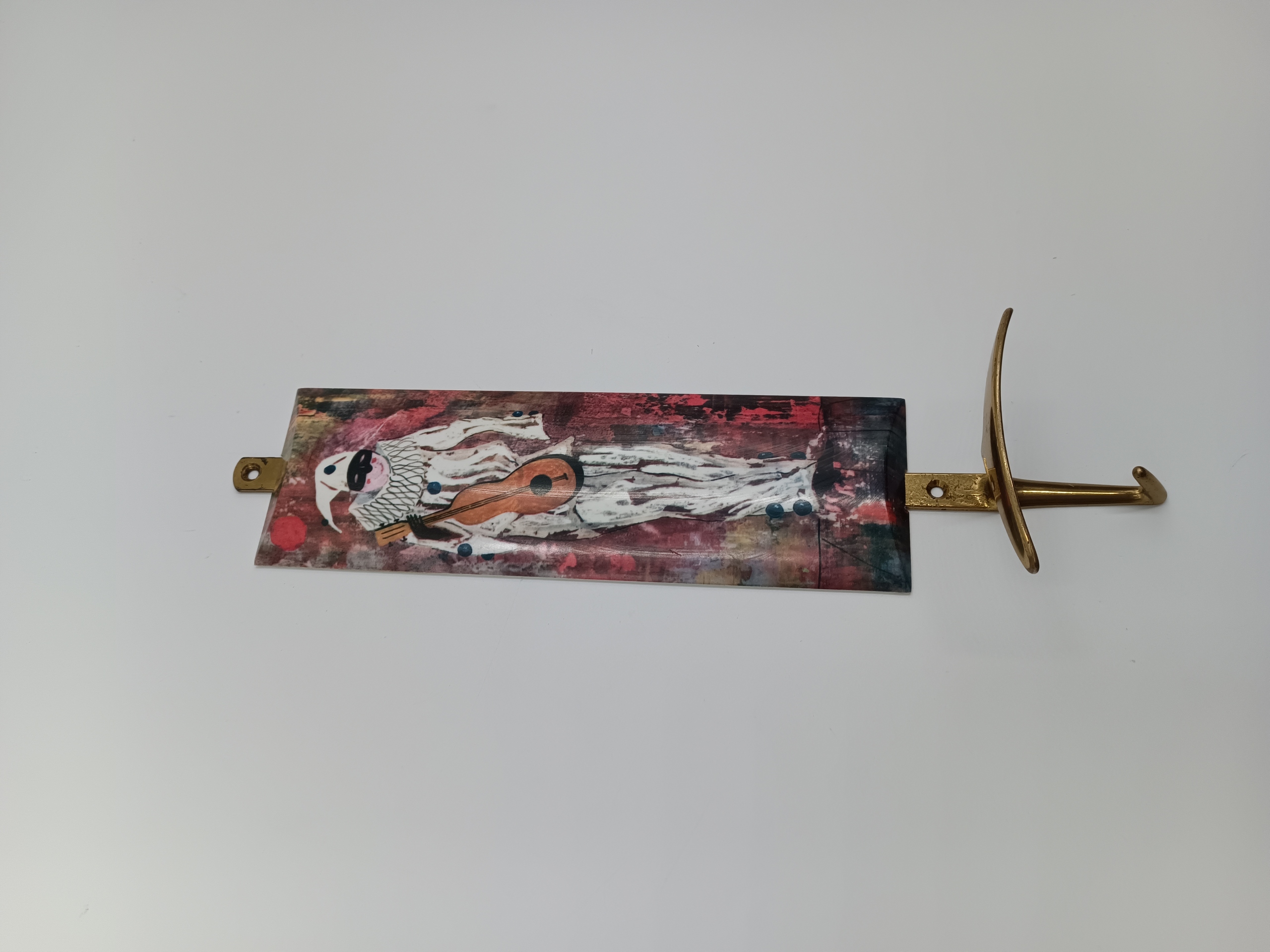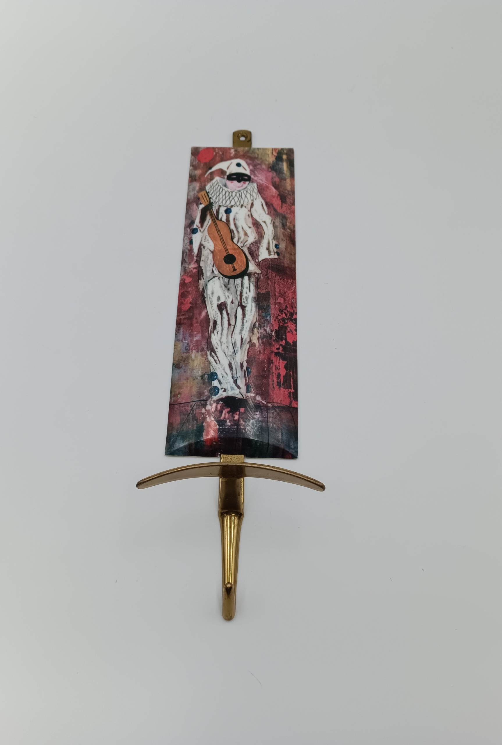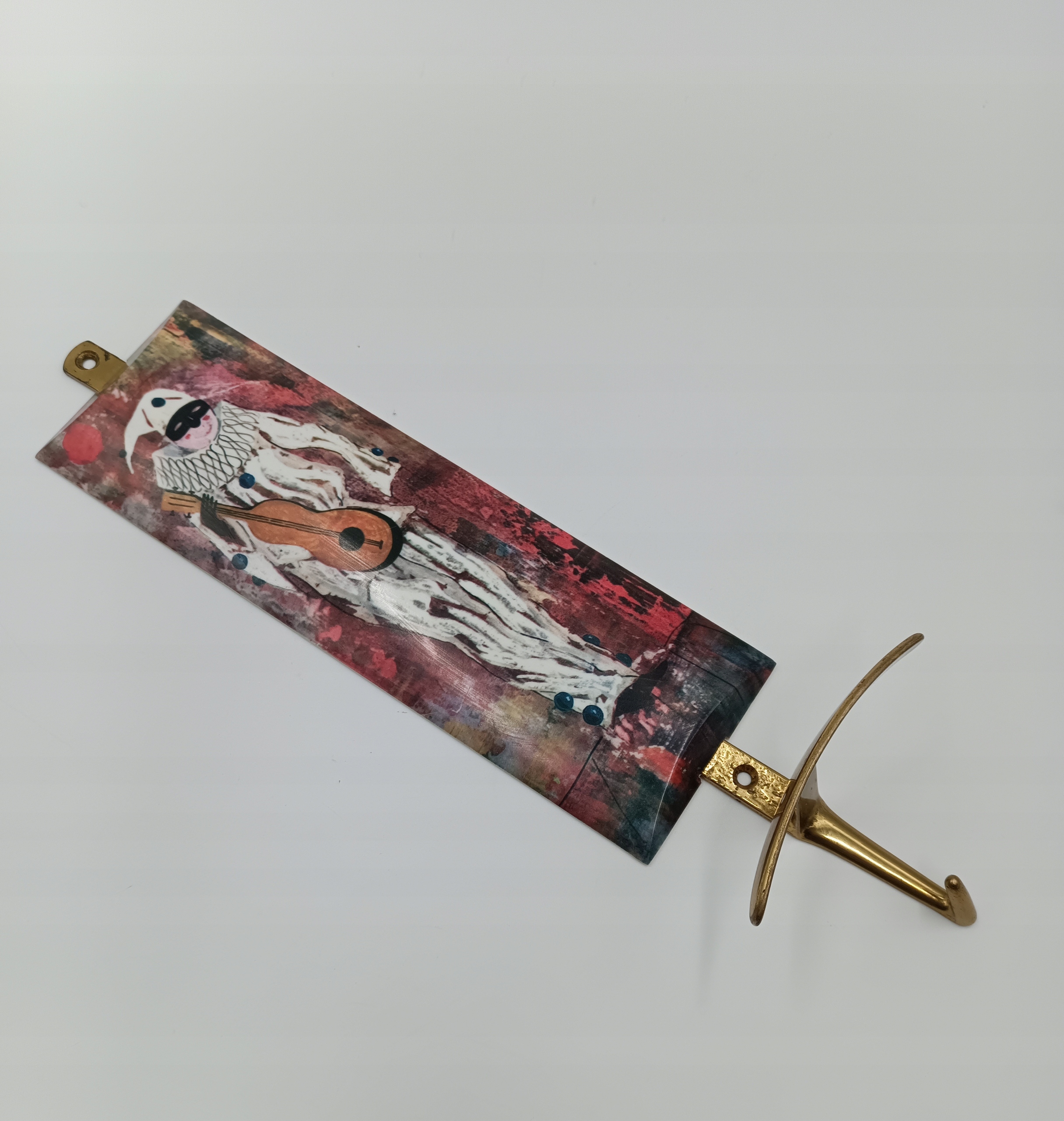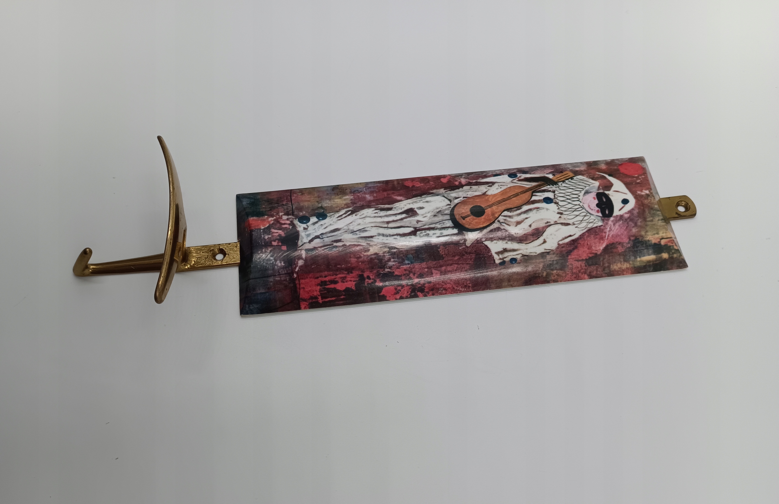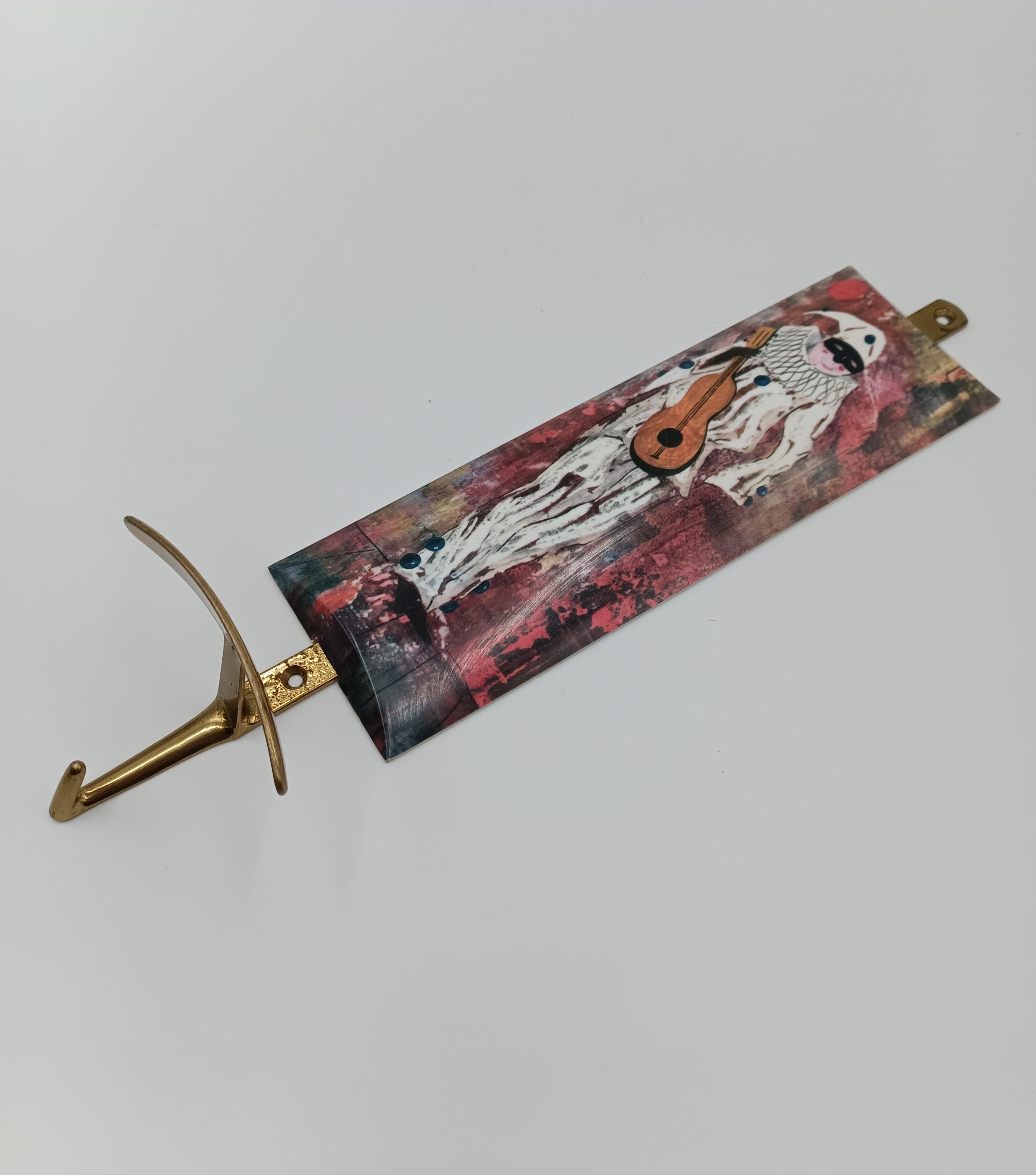 - На передней части вешалки изображена фигура в костюм Арлекина - держит музыкальный инструмент, напоминающий гитару.
