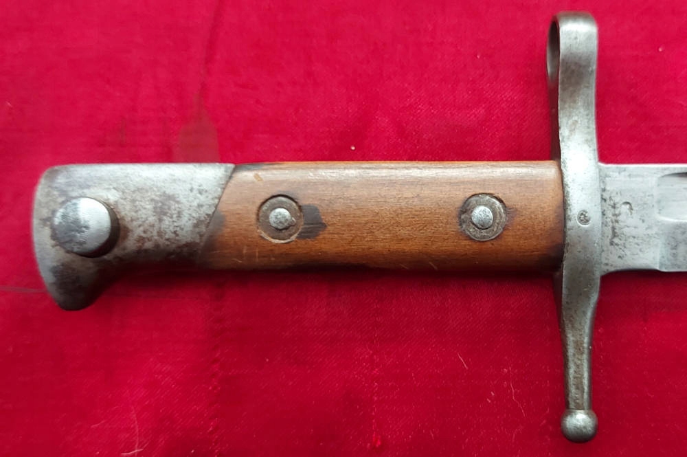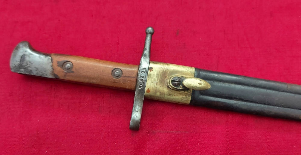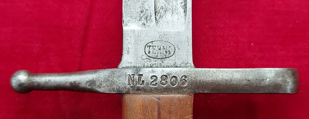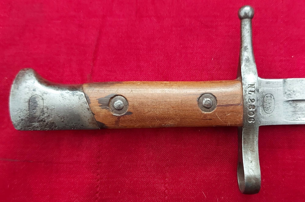 Тема продажи - итальянский байонет WZ. 1891 к каракано -винтовке. Неокрашенное лезвие, затопление фабрики. На пороге лезвия эллиптическая подпись terni (Заклади Заклади Фаббрика д'Арми ди Терни). С другой стороны, размытая подпись. На JELC номер оружия nl 2806 . Облицовка ручки - оригинальная деревянная. Замок штыка функционален. На голове видимое подписание. Кожа очень хорошо сохранилась. Он жесткий, не высушен. Подписание видимо на коже. Небольшая подпись на крючке влагалища. Штык хорош во влагалище. Длина влагалища 31см,
