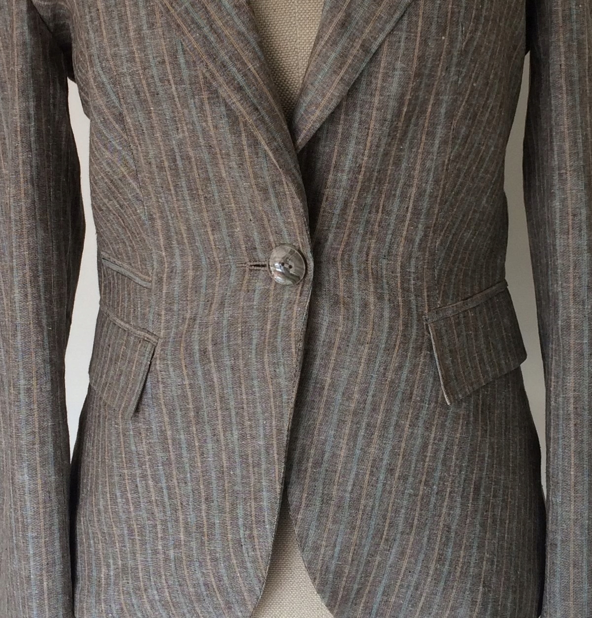 Эйрдальная куртка итальянской компании "Карла" из льна является отличным аксессуаром как для элегантной, так и для повседневной стилизации. Куртка в оттенках серого, в нежных бежевых синих полосах, закрепленной одной кнопкой, я идеально адаптируюсь к талии.