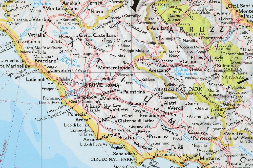 Итальянская карта стены в масштабе 1: 1 765 000 с элементами физических, дорожных и административных карт. Стилирование характеристики National Geographic. На карте, min.: