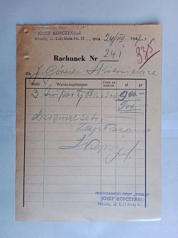 ІТАЛІЯ ВАРШАВА СТОМАР РАХУНОК 1947 Р 0528 Д
