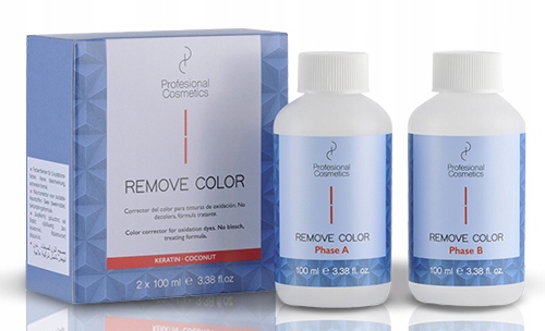 Смешайте жидкости из обеих емкостей в равных частях 1:1 в пластиковой таре. Аккуратно закройте оставшиеся части жидкостей крышками, стараясь не перепутать их. Нанесите сразу на сухие и немытые волосы. Накройте голову полиэтиленовой шапочкой и нагревайте 5–15 минут. По истечении этого времени тщательно вымойте волосы 2-3 раза шампунем, затем ополосните и высушите. Не втирайте Professional Cosmetics Color Remove в кожу головы. Если после сушки волос эффект неудовлетворительный, процедуру можно повторить. Нанесите на волосы 2% стабилизированный окислитель, оставьте на 3-5 минут, а затем тщательно смойте водой. Если после такой процедуры волосы потемнели, процедуру удаления пигмента следует повторить.