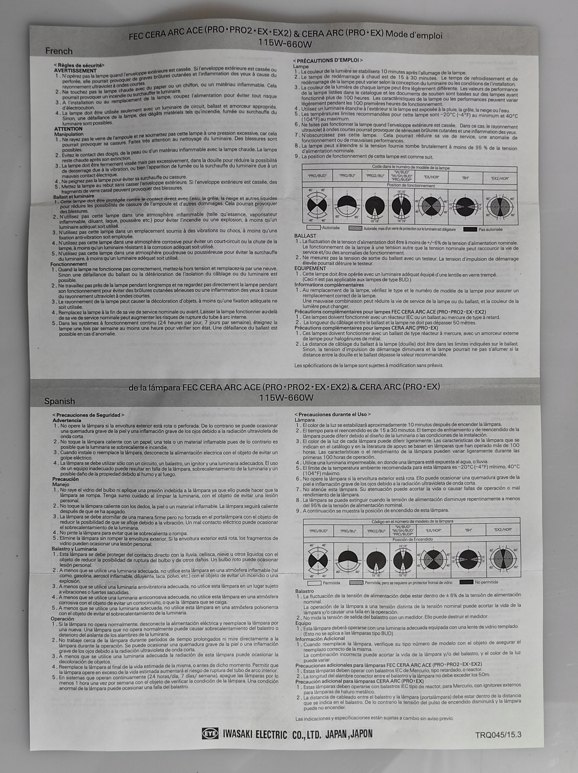 Производитель: Iwasaki Electric Co., Ltd H1> Модель: CM360FSL/ W/ SH/ BUD H1> Тип: керамический металлический галогный лампа H1> Обозначение E40 h1> Lampate Lampate (Nominal): NOMILINAL): 360W H1> Lampate (Nominal): NOMILINAL): 360W H1> (Оценка): 375W h1> Lamen Efficance Lamp: 112LM/ W H1> Начальный световой поток: 42000LM h1> Время согрева: 4min max. h1> лампы напряжения: 130V h1> текущие лампы: 3,3a h1> Общая длина: 292 мм h1> Диаметр лампы: 116 мм h1> Сделано в Японии h1> . Затраты на доставку: по запросу h1>