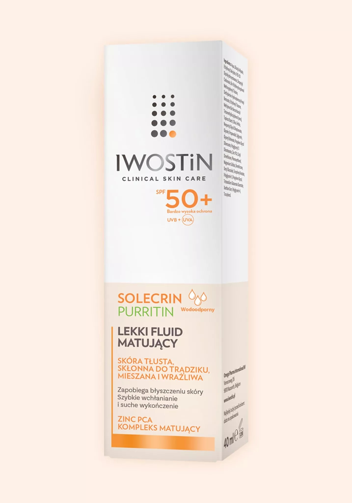 Iwostin Solecrin Purritin Легкий матирующий флюид SPF 50+, предотвращающий блеск кожи. Флюид можно использовать в качестве защитного крема для жирной, склонной к акне, комбинированной и чувствительной кожи, обеспечивая очень высокую защиту от UVA и UVB-излучения.