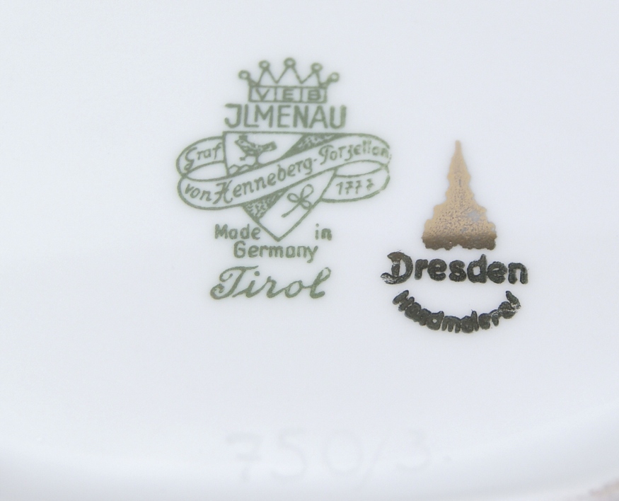 Шоколадница изготовлена из белого фарфора, украшена драконами, рельефом и позолотой. Фарфор Jlmenau с декором в Дрездене.