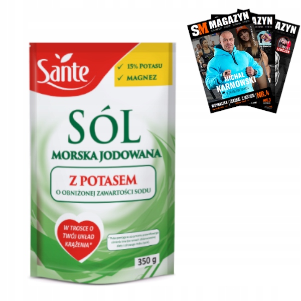 Соль Санте не содержит искусственного антислеживателя (Е536 - калий ферроцианид). Это источник природного магния, который эффективно предотвращает слипание соли, делает соль идеально сыпучей и простой в использовании. Соль Sante обогащена йодом. Этот ценный элемент способствует правильному производству гормонов щитовидной железой и правильному функционированию нервной системы. Соль «Санте» прекрасно подчеркивает вкус и аромат блюд – благодаря ей можно ограничить использование других специй, содержащих консерванты.