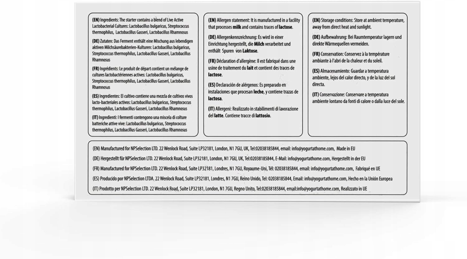 Фермент содержит смесь живых, активных культур молочных кислот бактерий: Lactobacillus bulgaricus, Streptococcus thermophilus, Lactobacillus rhamnosus, Lactobacilus gasseri