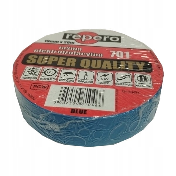 Лента электроизоляционная синяя размером 19ммх20м из ПВХ. Благодаря своим свойствам он устойчив к неблагоприятным погодным условиям, то есть ультрафиолетовым лучам и низким температурам (до -18 градусов С).