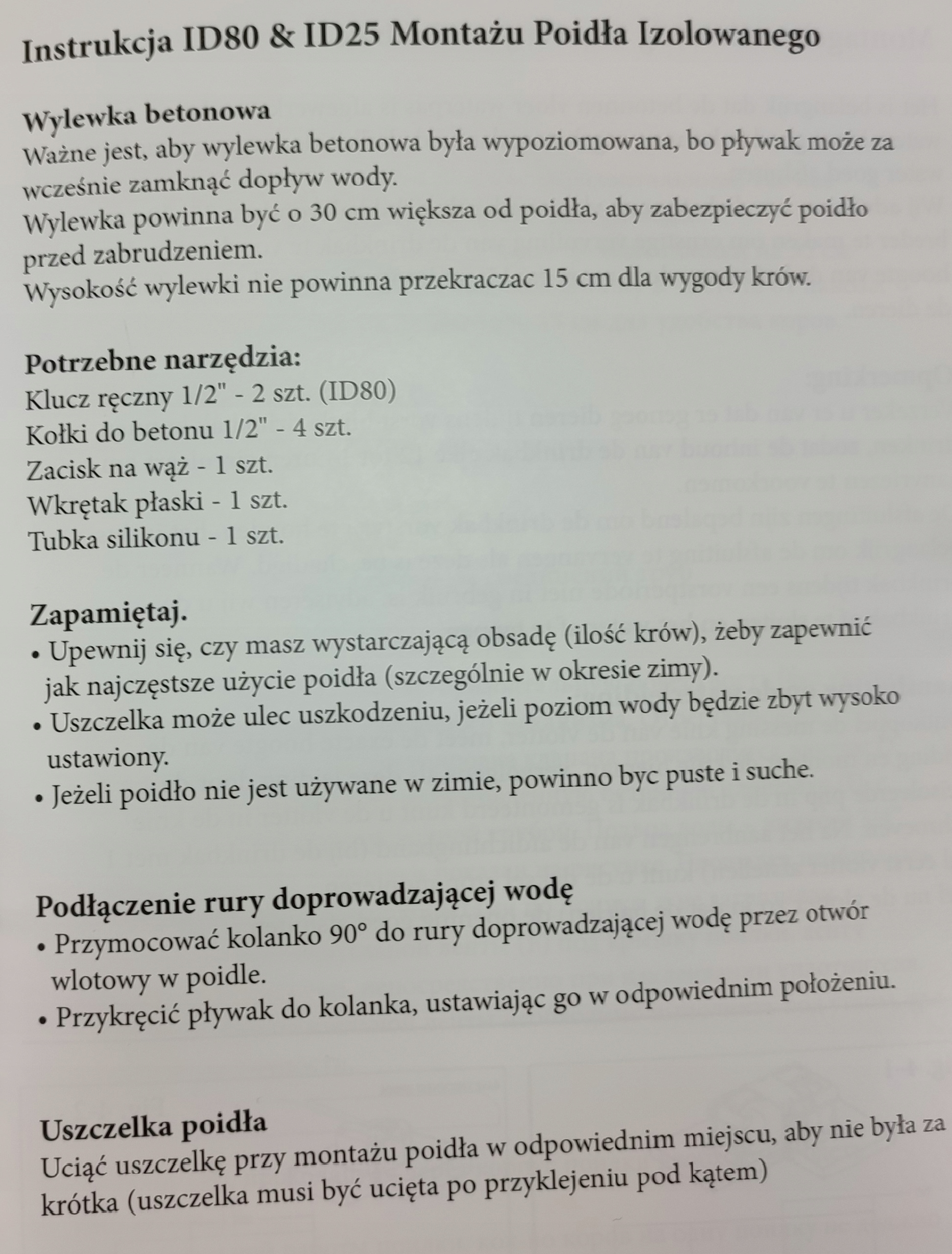Каждая поилка оснащена поплавковым клапаном производительностью 36 л/мин, большой сливной пробкой (75 мм), 1 или 2 белыми шариками доступа, гибким шлангом ½ дюйма в стальной оплетке ( для подвода воды из нижних поилок) и 1 метр изоляционной втулки для водопроводной трубы.