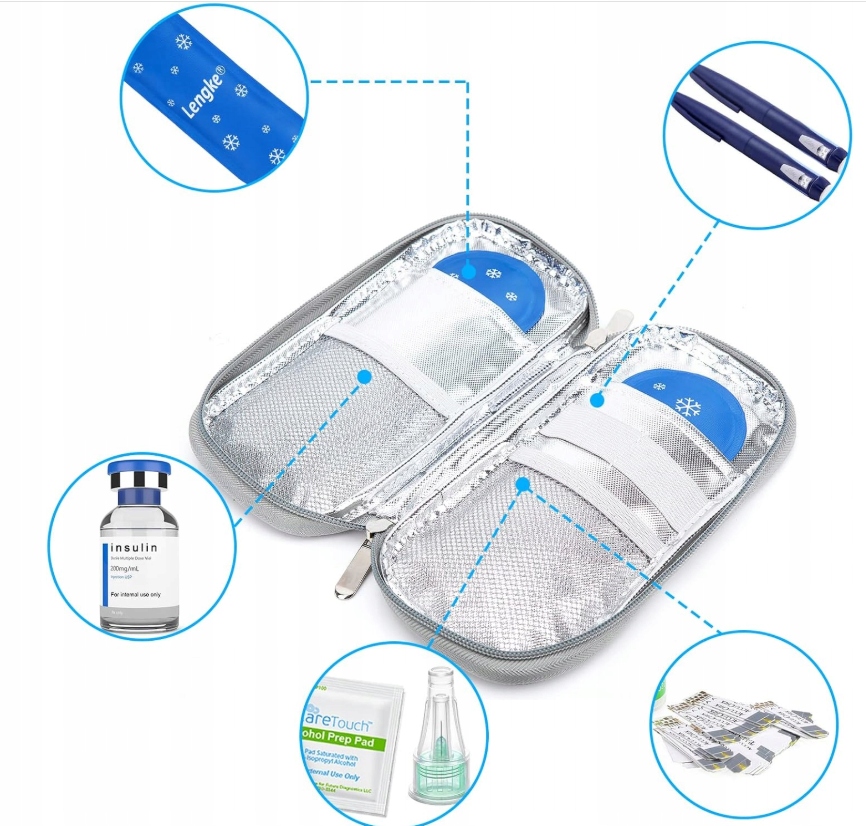Особенности: Легкий и удобный; хранит инсулин в холодильнике 6-8 часов; содержит 2 многоразовых гелевых пакета со льдом; улучшенная изоляция для лучшей устойчивости; вы также можете хранить лекарства, бинты, ватные палочки, тест-полоски, марлю и т. д.