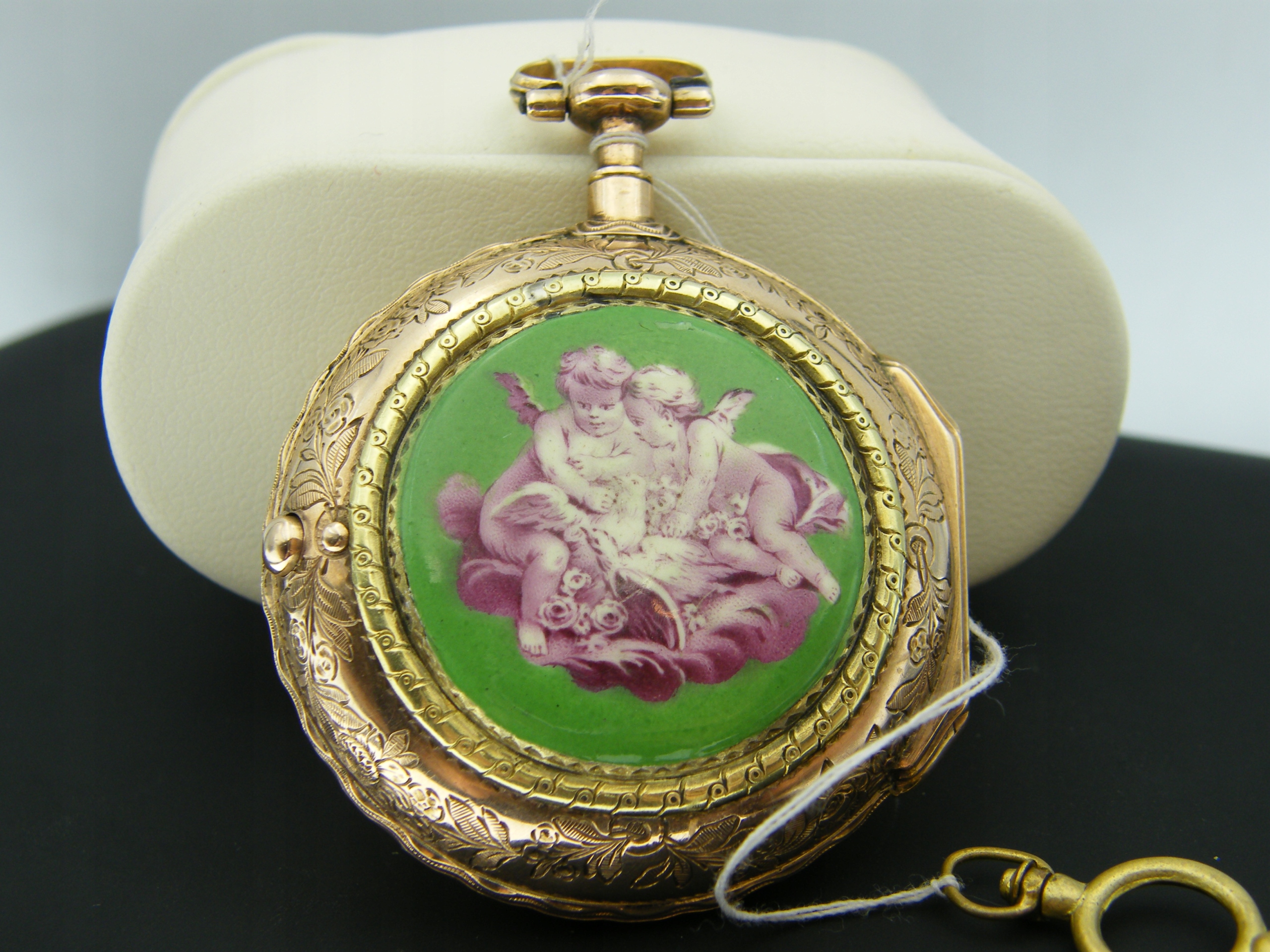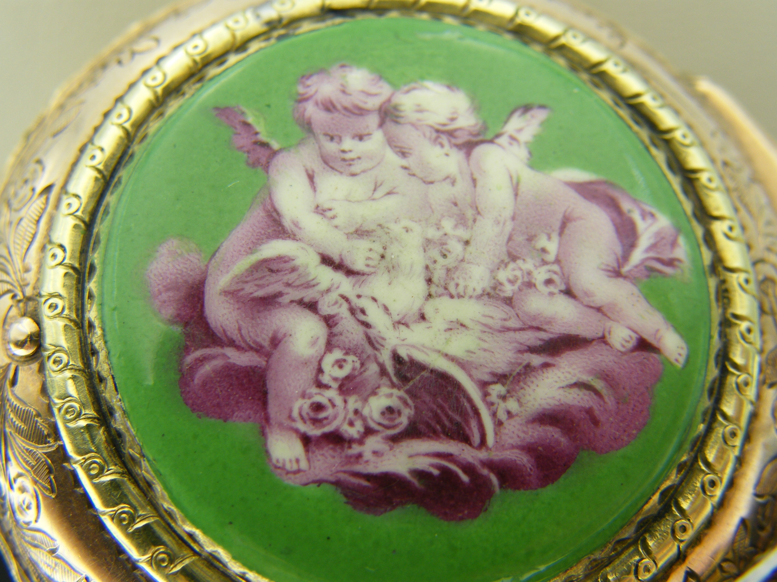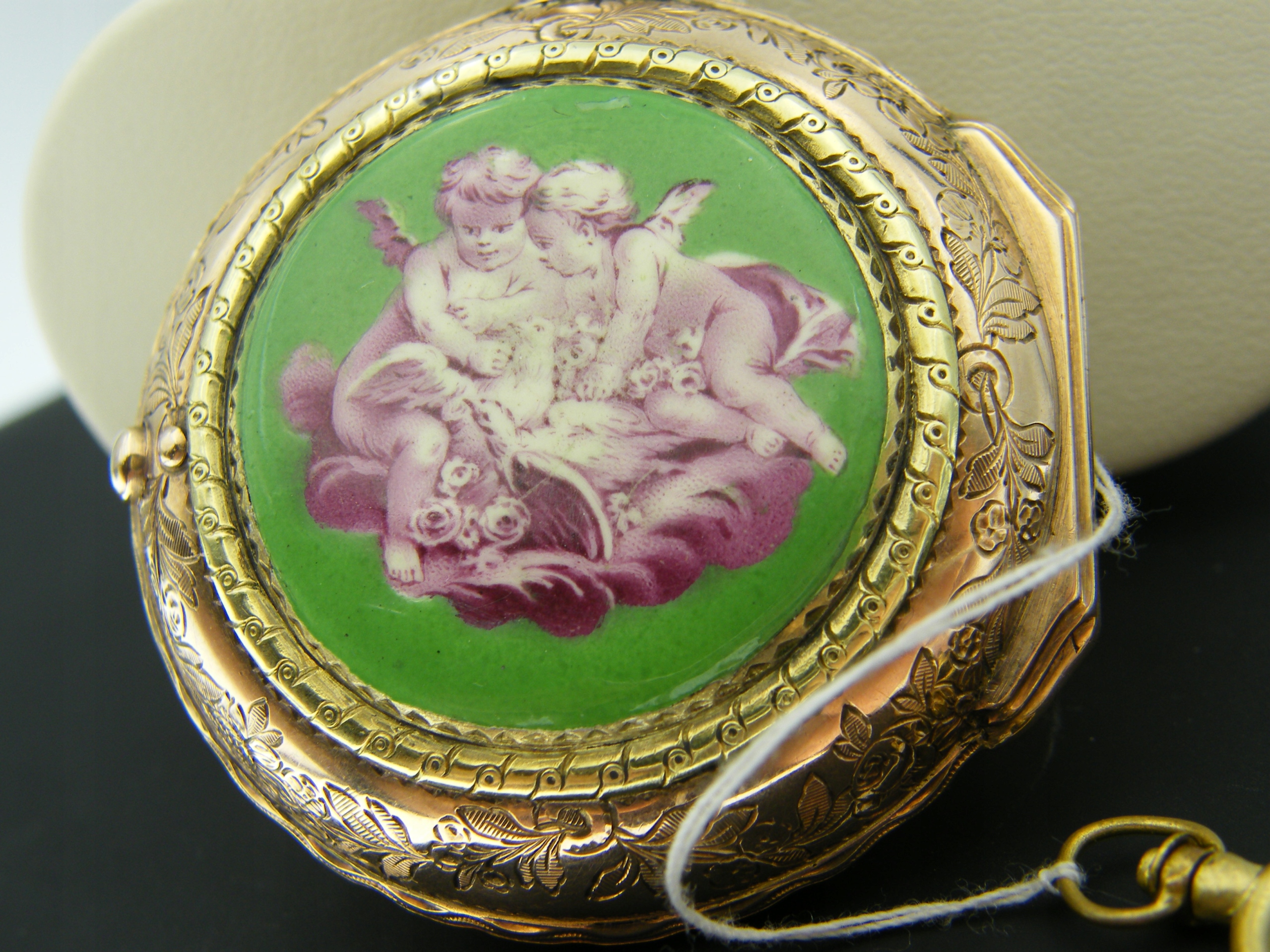 В золотой энхларе 18K Encalar Pr.0750 с фарфоровым экраном и ангелами в эмале на задней крышке