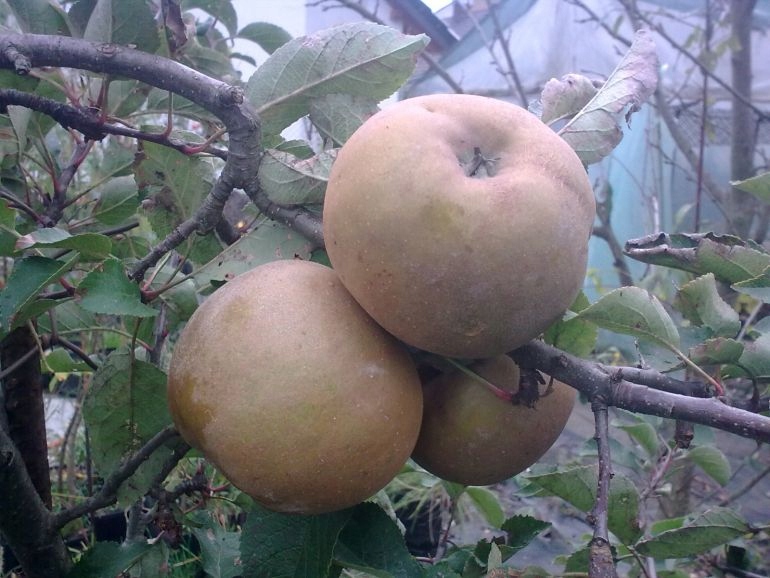 Плод — крупный, слегка приплюснутый. Кожа зеленая, красновато-коричневая или краснеющая. Мякоть плотная, средней сочности, кисловатая.