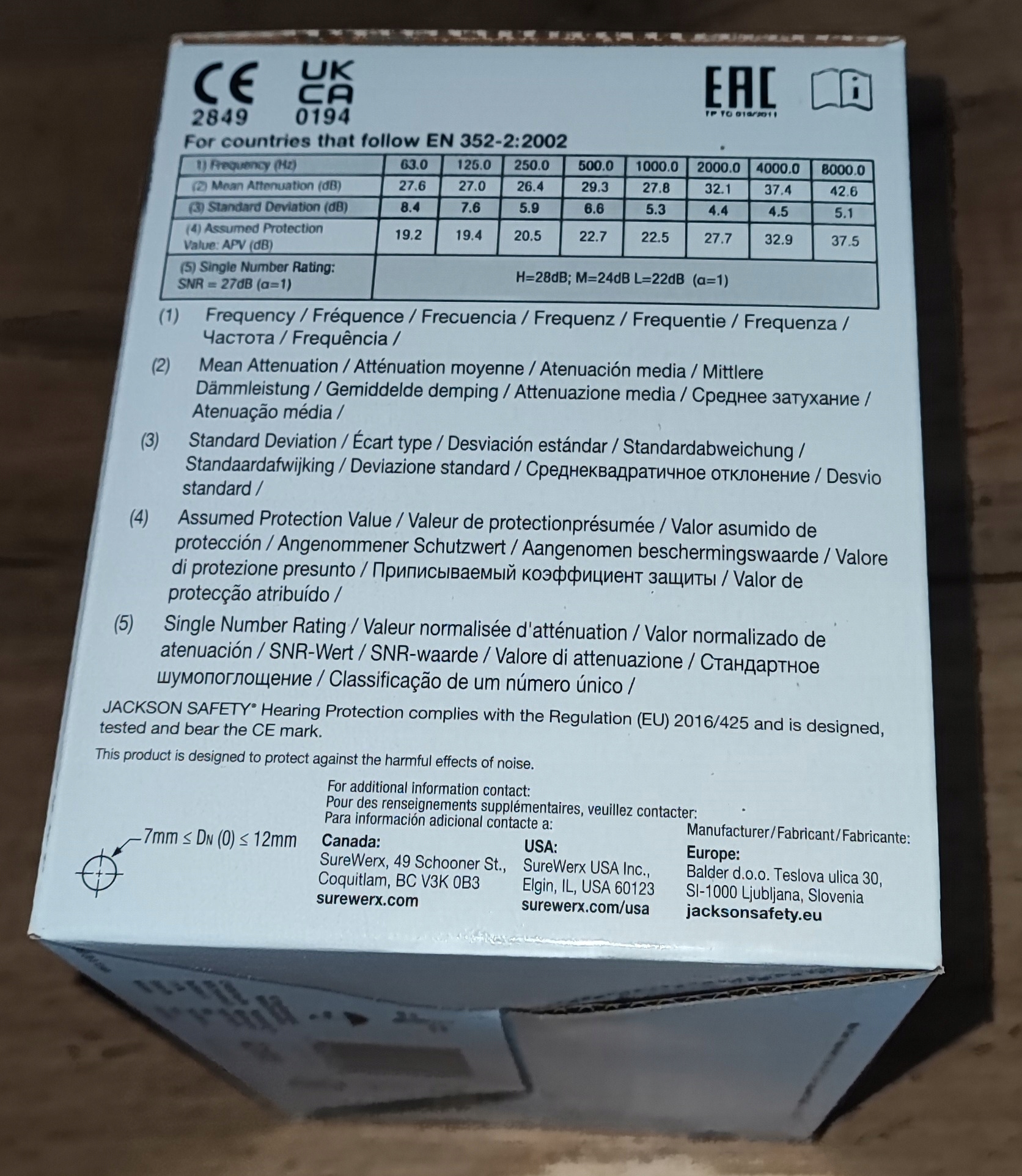 - Эта продукция соответствует требованиям Европейской гармонизированной стандарт EN 352-2:2002.