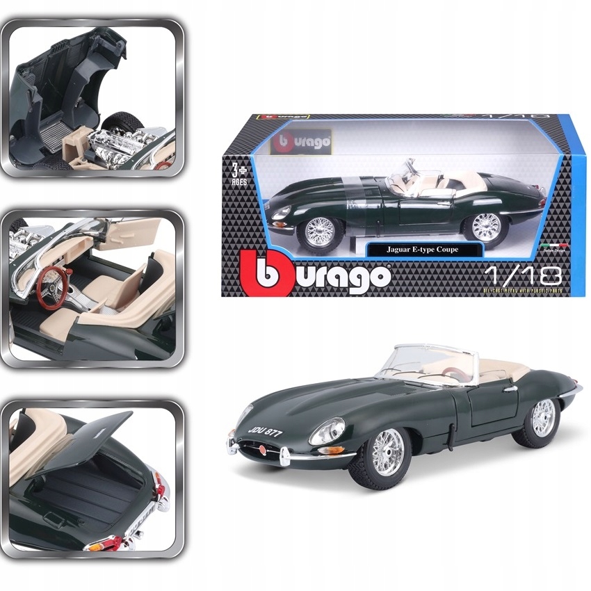 Модель Bburago Jaguar E-Type Cabriolet (18-12046) в масштабе 1:18. Модель выполнена из металла, с пластиковой фурнитурой. Имеет подвижные элементы - двери, капот, багажник.