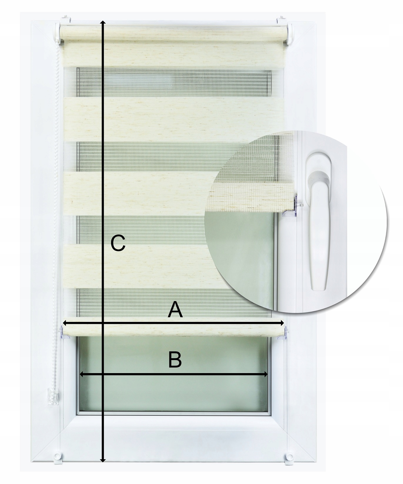 Измерьте ширину стекла (B) и прибавьте от 4 до 6 см, таким образом вы получит ширину слепых (A). Помните, что рулонная штора должна быть немного шире стекла, но не закрывать ручку. Рекомендуемое минимальное расстояние ткани от ручки — 0,5 см.
