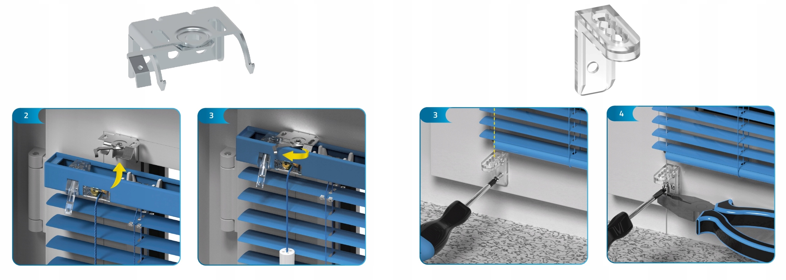 ▶ Рис. 2 и 3 -Верхние кронштейны универсальны, позволяют крепить жалюзи к оконной раме, потолку и стене.