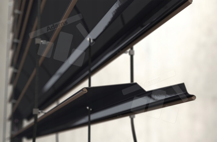 Рамки фасадных жалюзи изготовлены из алюминия и окрашены порошковой краской в несколько стандартных цветов. Цвет ламелей может быть одинаковым по отношению к конструкции или совершенно отличным от нее (это полностью индивидуальное дело, в зависимости от предпочтений заказчика). Жалюзи рейки крепятся к жалюзи с помощью специального текстиля (лестницы). Их цвет автоматически подбирается под цвет ламелей. Схема ламели ниже: