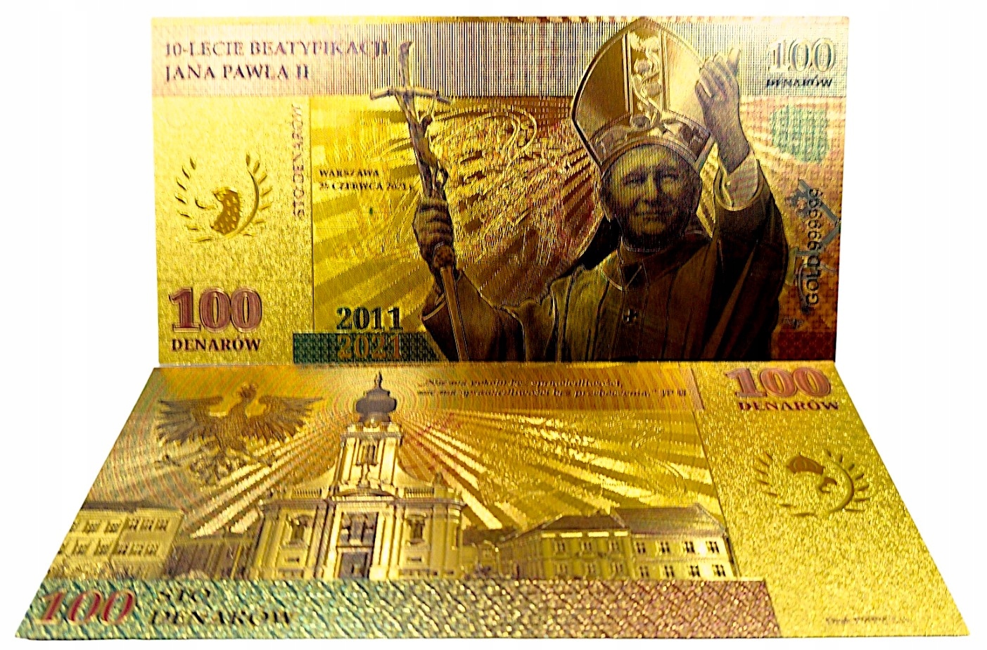 JAN PAWEŁ II 100 DENARÓW Piękny Pozłacany Kolekcjonerski Banknot RARYTAS
