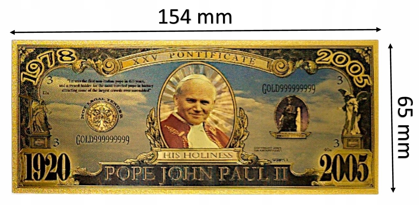 Позолоченная банкнота – необыкновенный коллекционный сувенир, и когда на нем изображена такая уникальная фигура, как Иоанн Павел II, и он становится настоящим сокровищем для каждого любителя истории и религии.