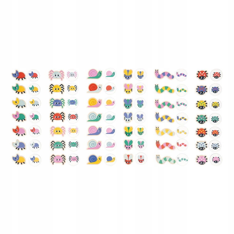 В наборе состоят 42 разноцветных деревянных насекомых (жуки, дождевые черви, пауки, божьи коровки, мухи и улитки – по 7 каждого вида, но каждого разного цвета) и такое же количество соответствующих картонных жетонов в мешок.