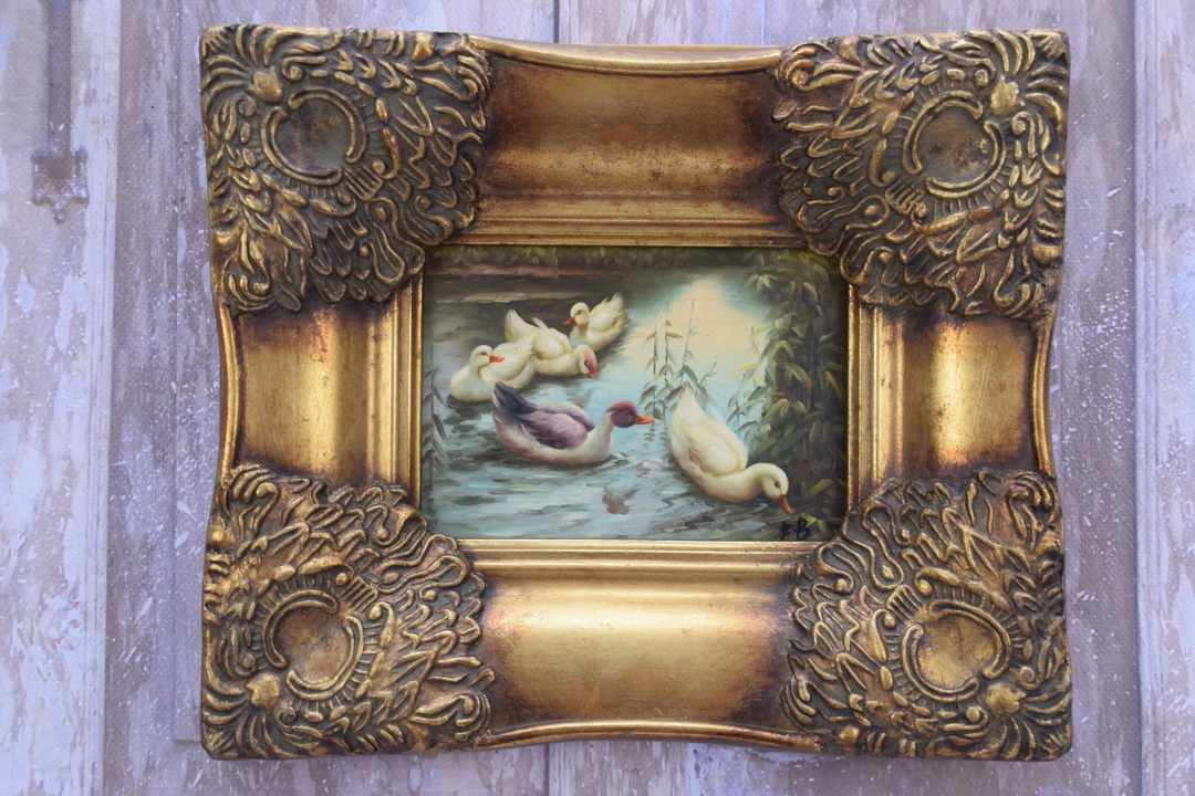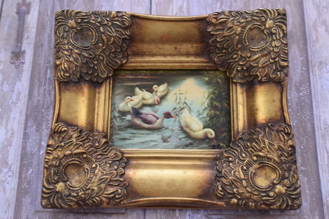 Жанрова сцена - Качине сімейство Качки - Картина маслом - Золота рамка