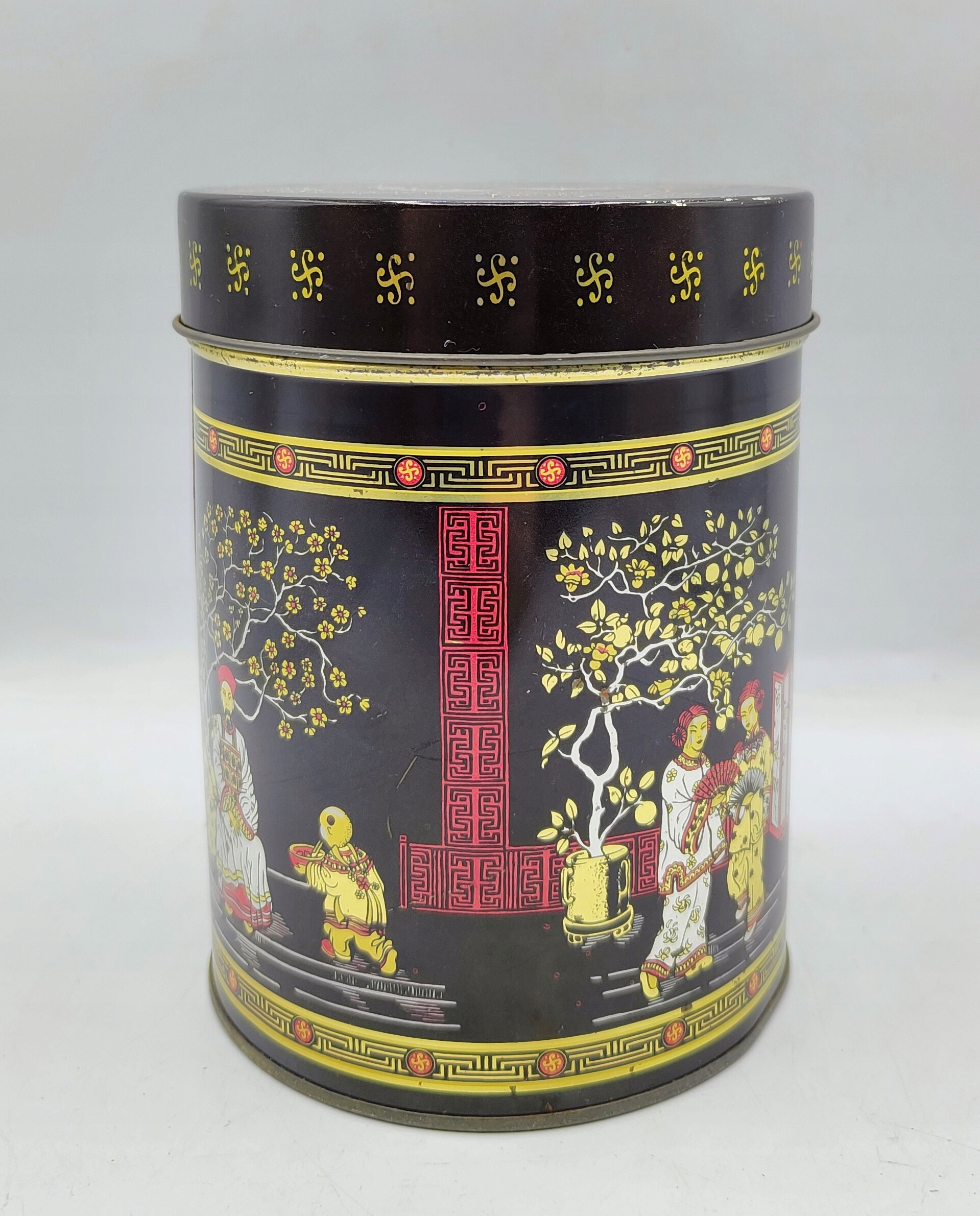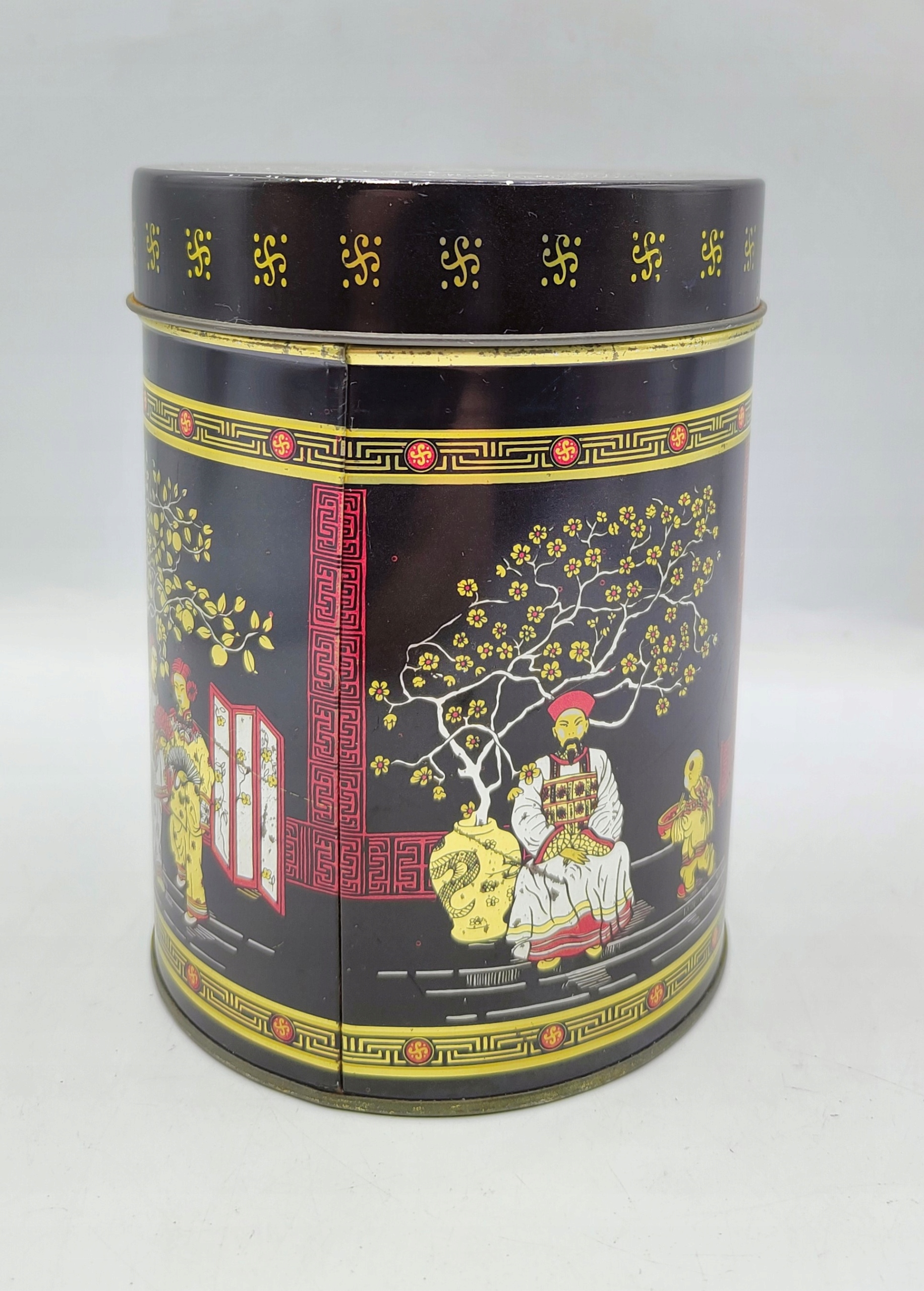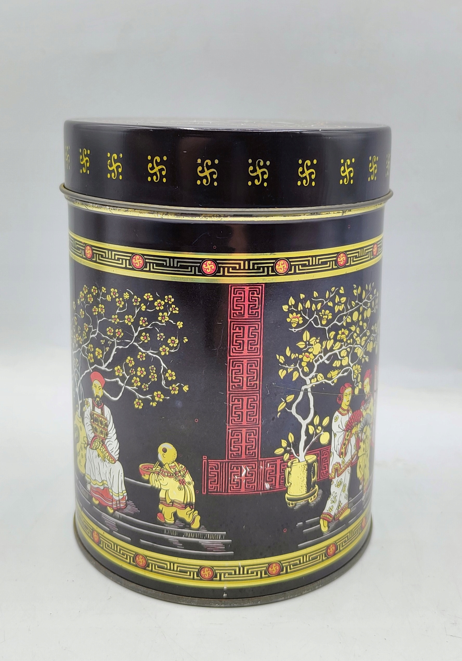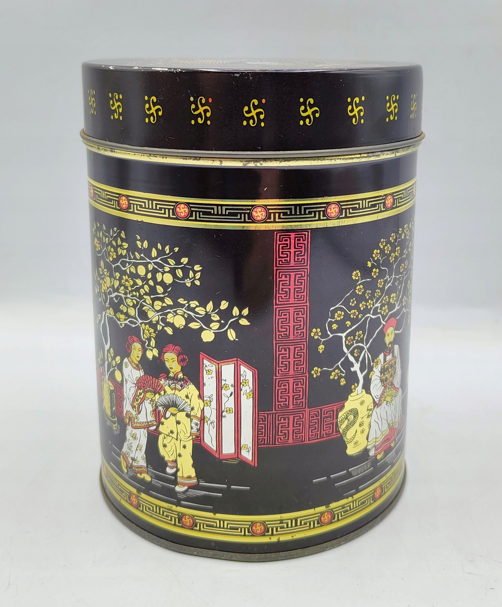Japonia śliczna STARA puszka, kwiat wiśni, gejsze MISTRZ i czaple