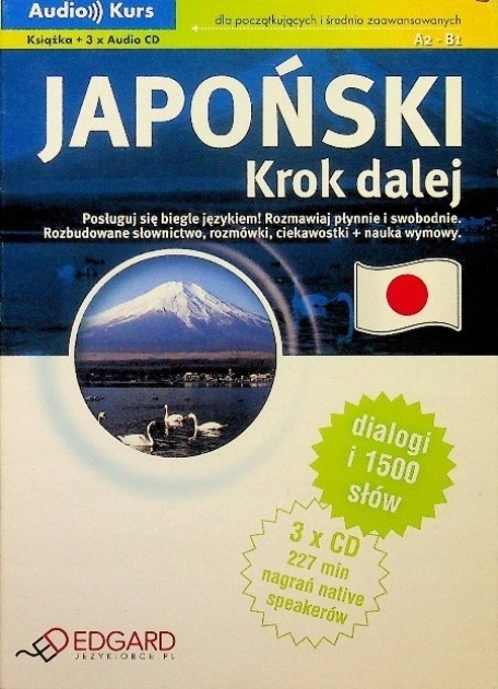 Японский Шаг дальше - 227 минут качественных записей - профессиональные спикеры, - 1500 необходимых слов и выражений, - обучение правильному японскому произношению, - практические и интересные диалоги, - многочисленные тестовые упражнения, - иллюстрированные интересные факты о Стране восходящего солнца, - письмо латиницей, кандзи и фуриганой. Японский шаг дальше предназначен для людей, владеющих основами языка и имеющих средние знания. Он расширяет ваши знания японского языка, помогает расширить словарный запас и улучшить разговорные навыки на среднем уровне (A2-B1). Курс обучает 1500 словам и фразам, необходимым в повседневном общении. 17 уроков охватывали темы, связанные с работой, жильем, свободным временем, поиском друзей, повседневными делами и путешествиями. Кроме того, каждая глава содержит иллюстрированные природные и географические диковинки, а также информацию о самых интересных местах Японии. В курс входит: книга и 3 аудиодиска с записями. Книга (216 страниц) содержит 17 тематических уроков, наборы лексики, предложений и диалогов, а также записи с переводом на польский язык. Более того, здесь собраны интересные факты и дополнительные разделы для амбициозных людей. Обширное введение в доступной форме объясняет правила японского произношения. Качественные записи (227 мин) позволяют прослушать язык, выучить его мелодику и выучить правильный японский акцент. Все слова, фразы и диалоги, а также их переводы были озвучены профессиональными носителями японского языка. Вы учитесь, не заглядывая в книгу!