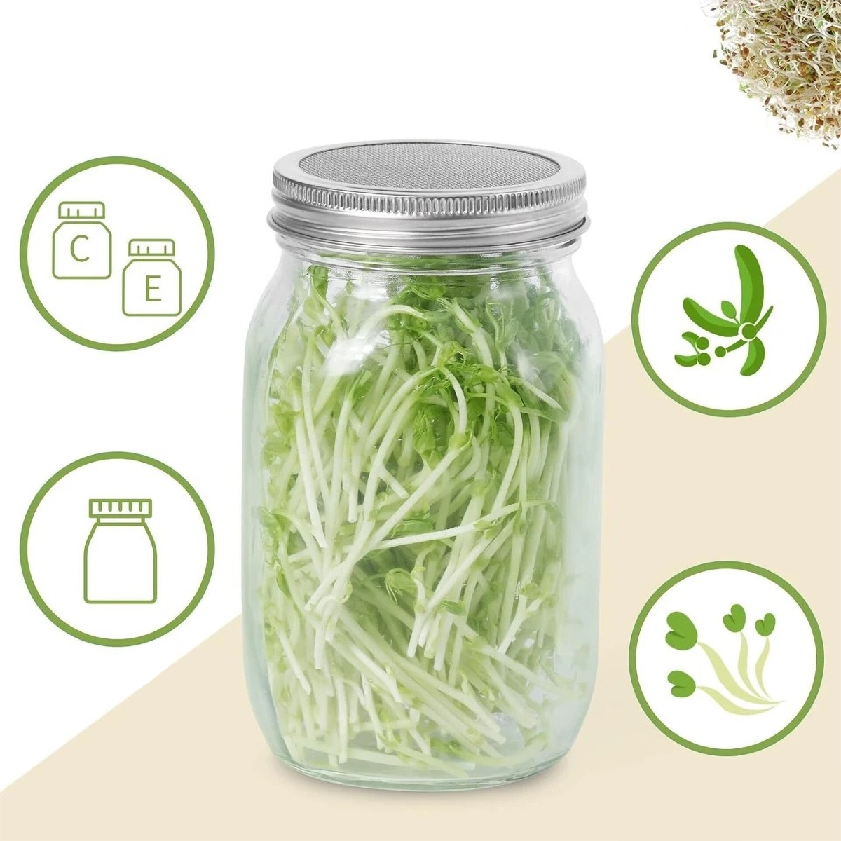 Вы можете легко выращивать свои собственные ростки даже без почвы. Вы можете не только вдохновлять свою семью и друзей на выращивание собственных ростков, но и детям будет пользоваться приверженностью, научиться расти ростки и веселиться во время этого процесса. Наша банка прорастания создает идеальное прорастание микроклимат, а вкусные ростки готовы к употреблению через 4-6 дней.