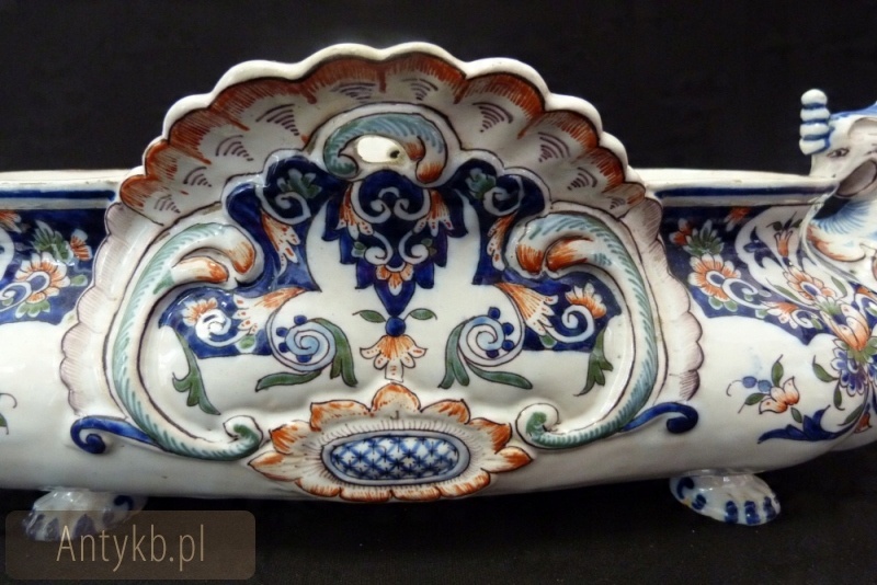 Впечатляющая жардиньерка, Франция, конец 19 века, около 1880 года. DESVRES Руанский фаянсовый декор, выполнен из фаянса, расписан вручную. Опирается на 4 ножки, ручки - головы дракона. Все детали хорошо сохранились. Также отлично подходит для фрукты.Приглашаем к покупке.