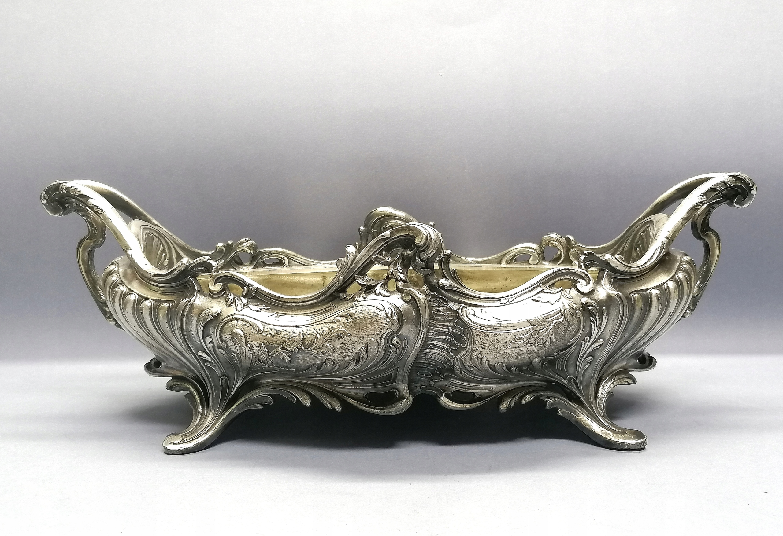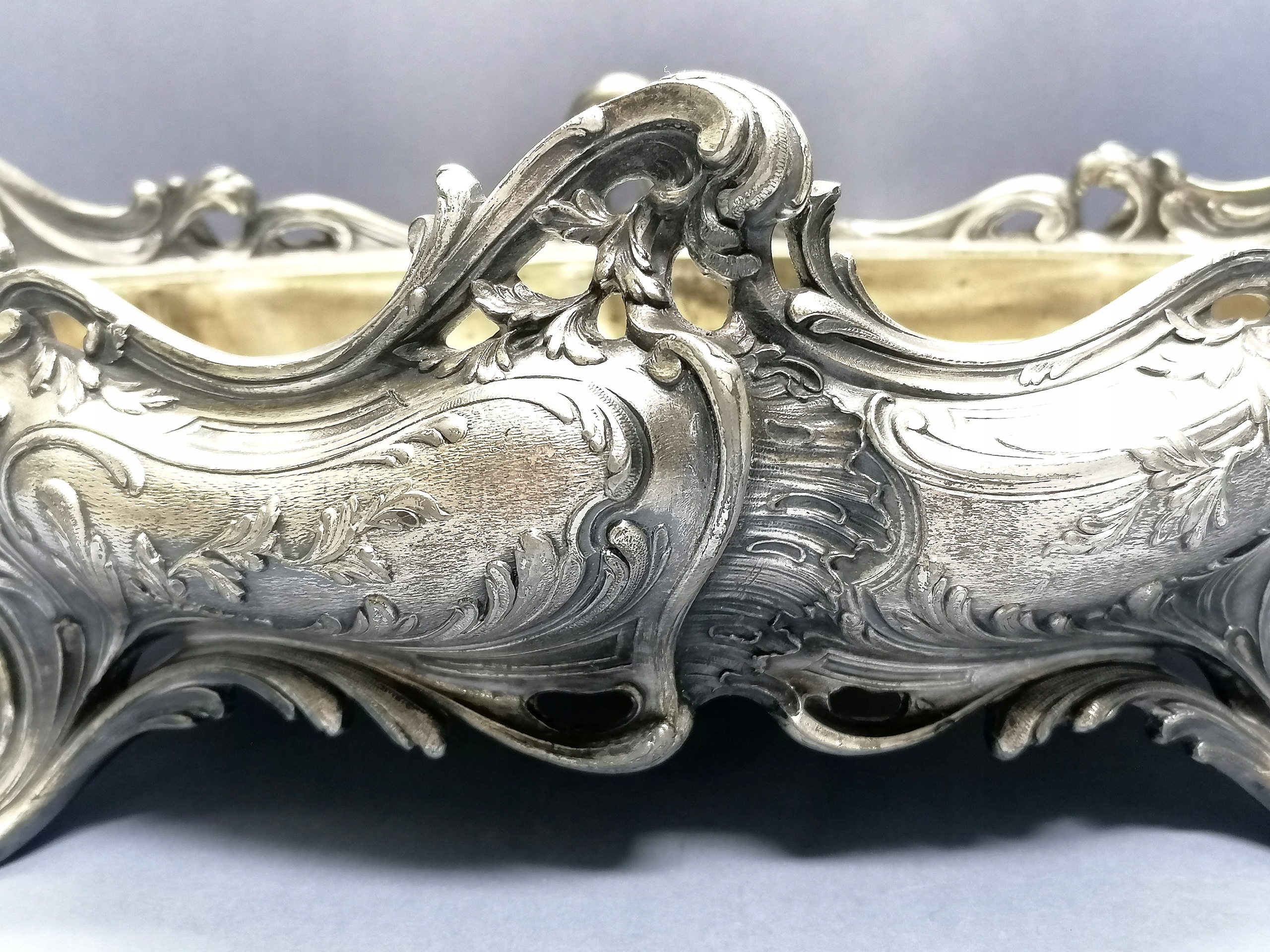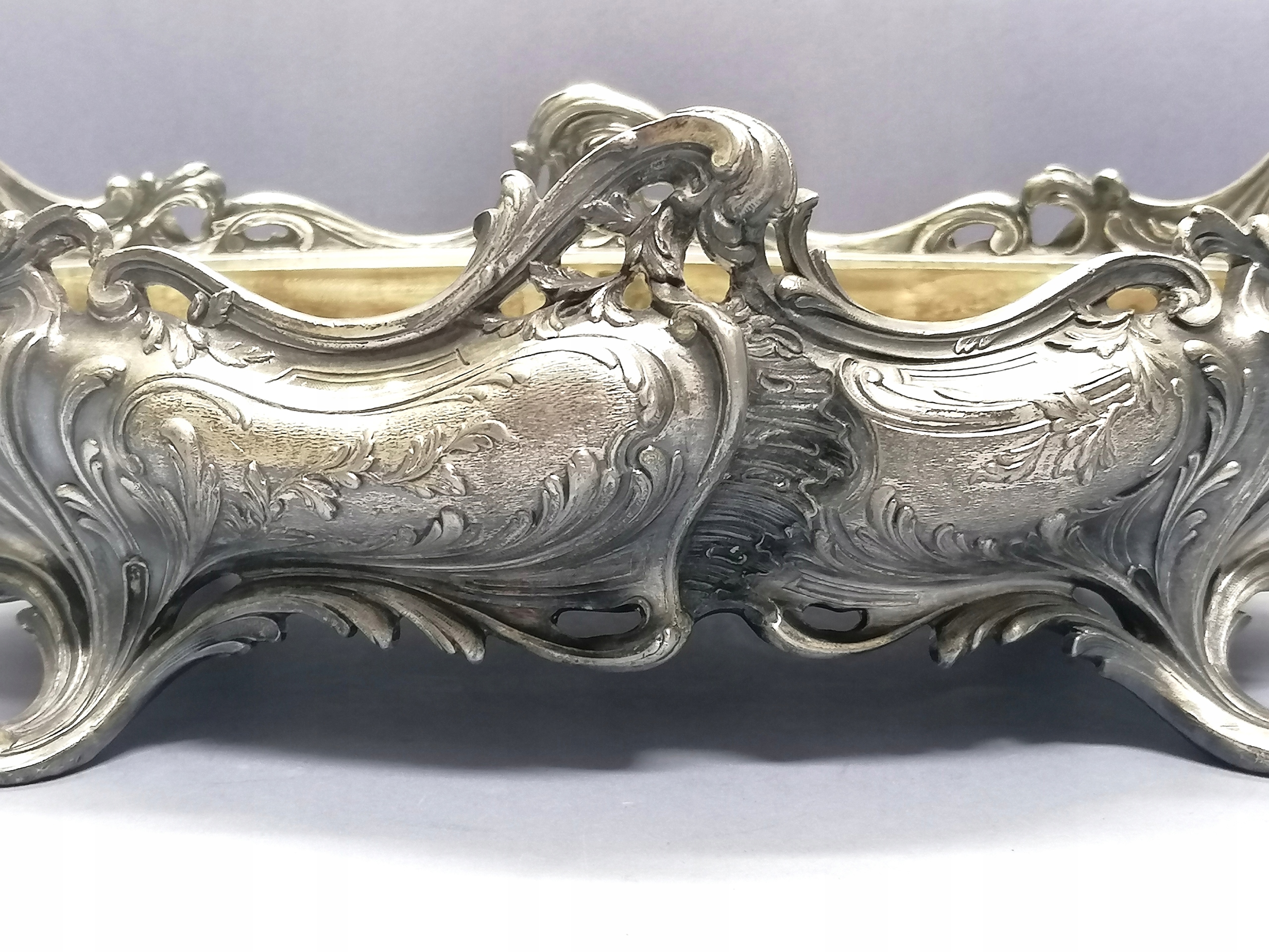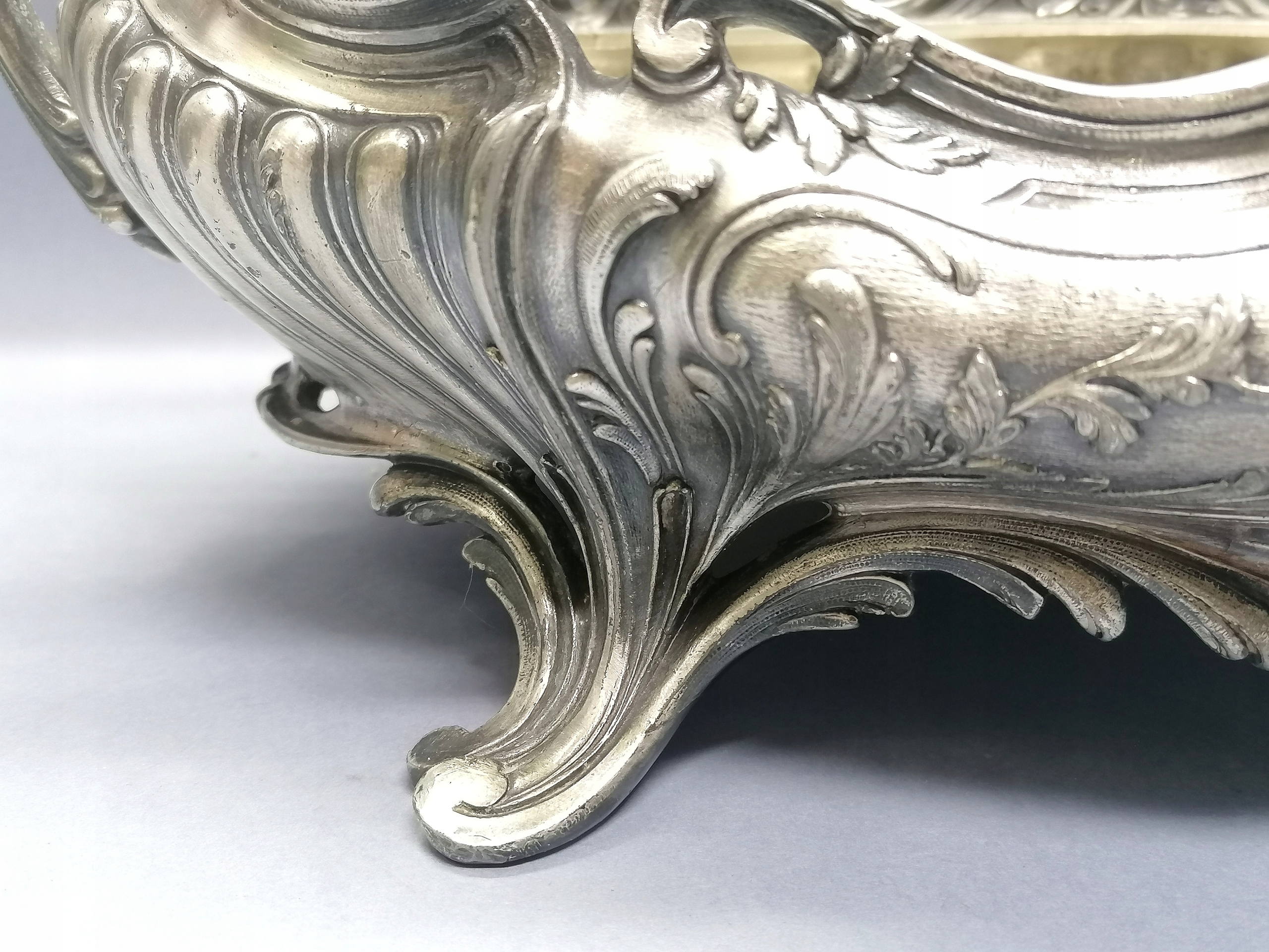Украшения в типичном стиле модерн - ручки, ножки и ажурный рокайль с завитками растительного орнамента и мотивом ракушки на внутренней стороне сосуда. Жардиньерка изготовлена из жести, густо посеребрена, покрыта патиной, без потертостей при серебрении.