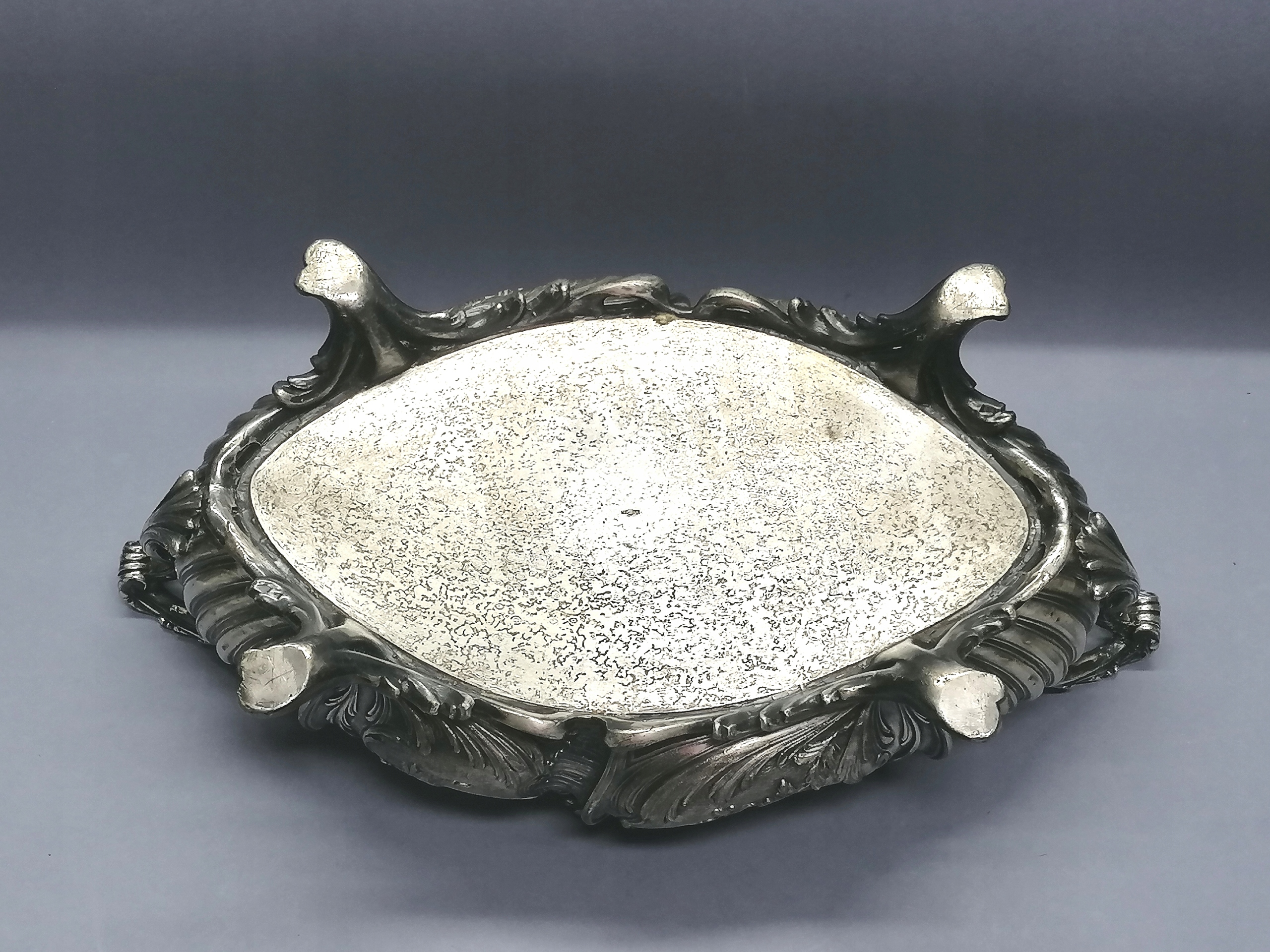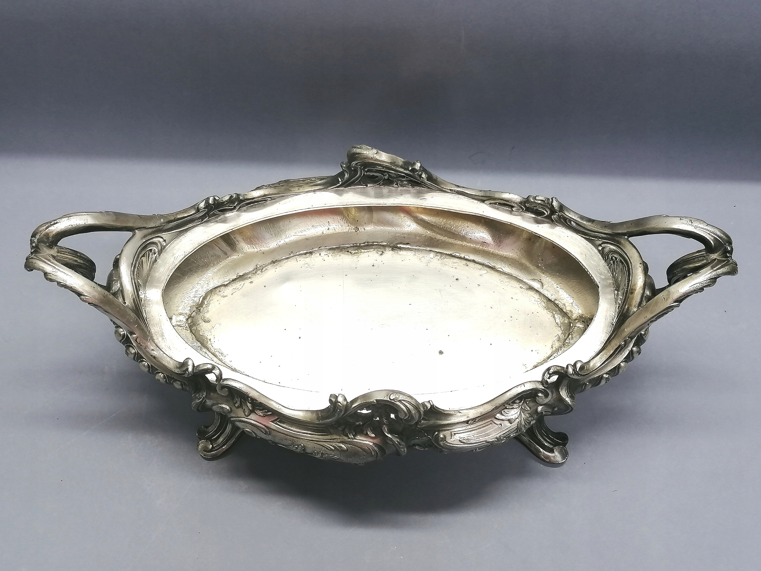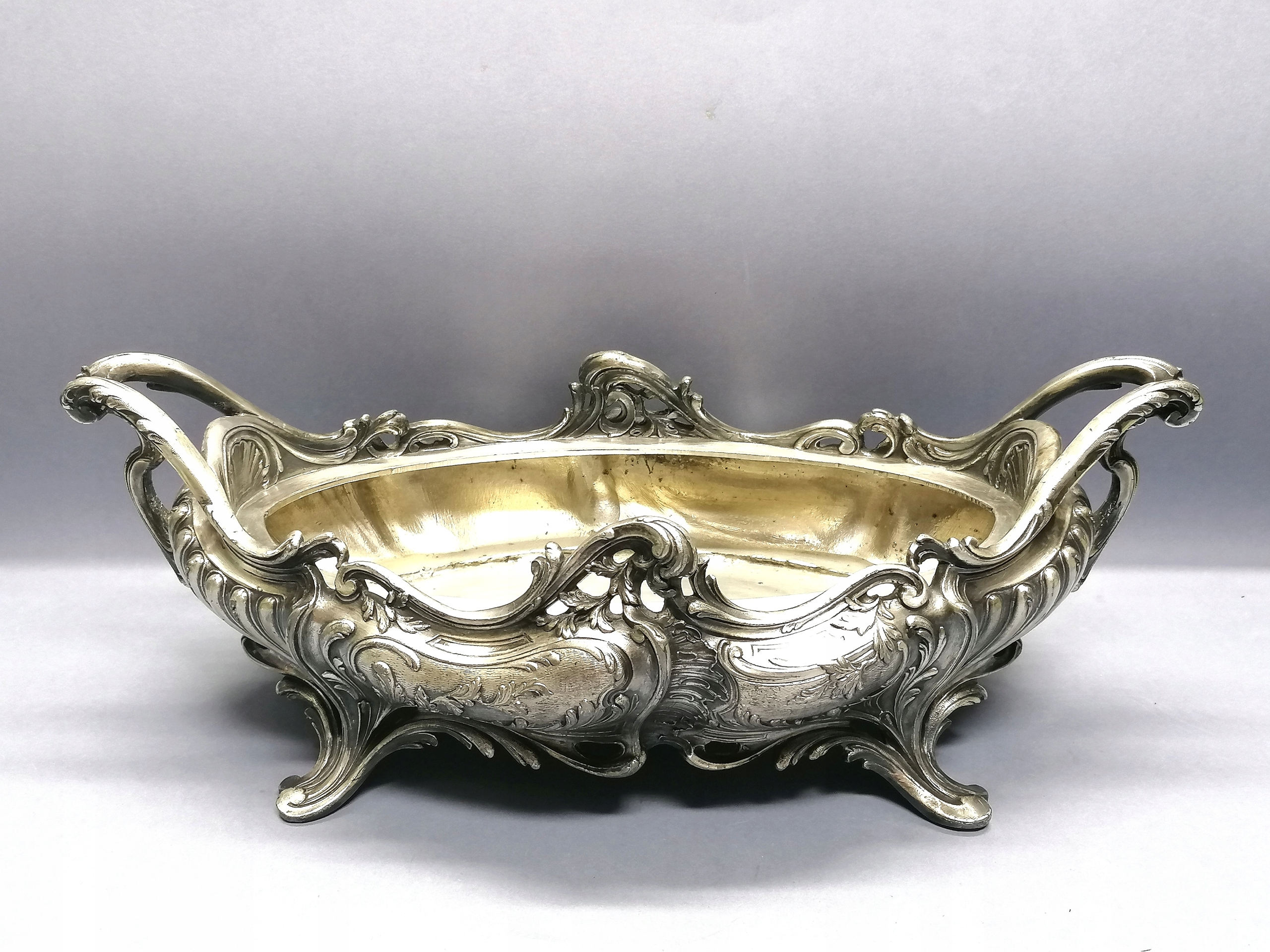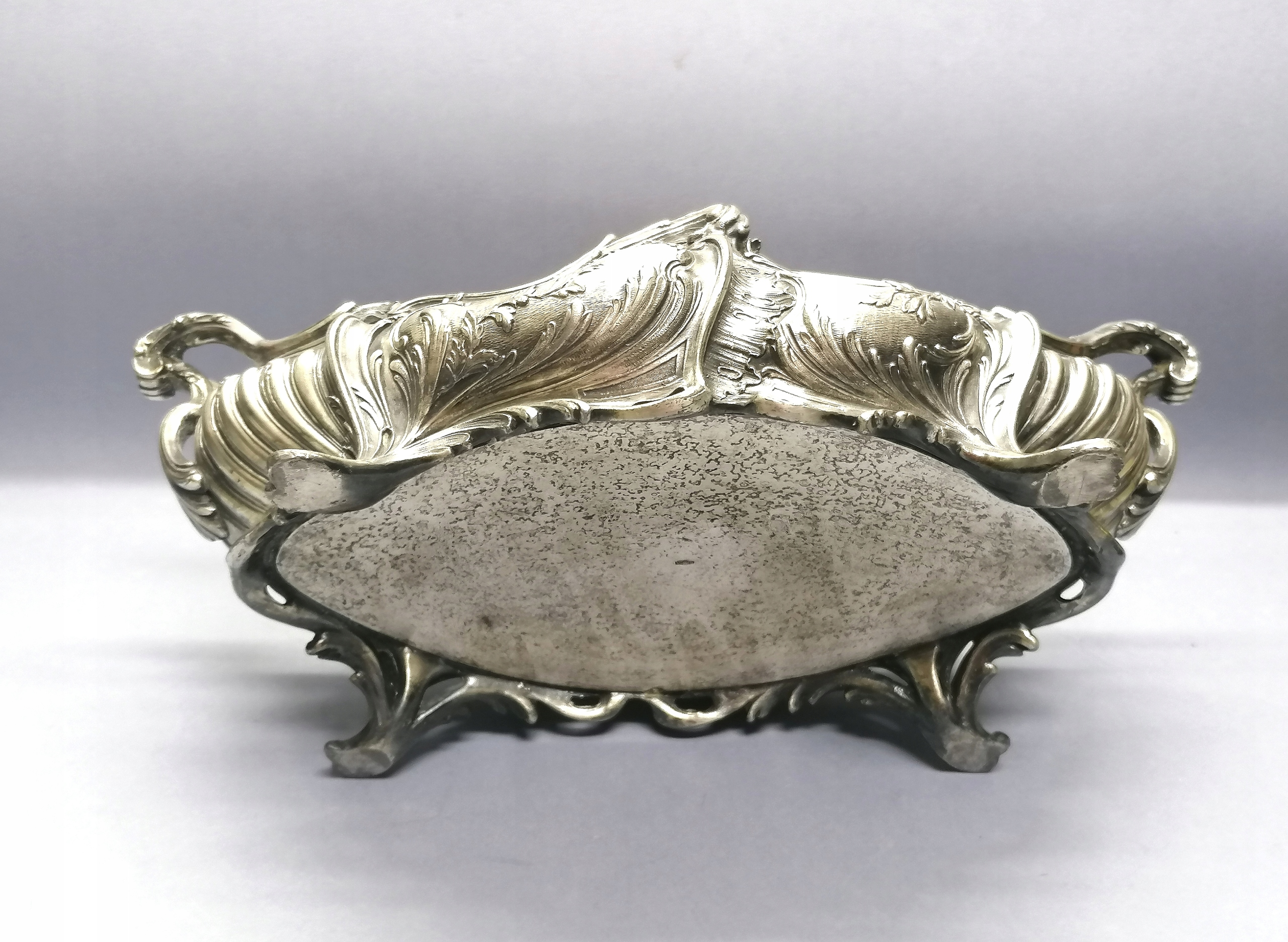Украшения в типичном стиле модерн - ручки, ножки и ажурный рокайль с завитками растительного орнамента и мотивом ракушки на внутренней стороне сосуда. Жардиньерка изготовлена из жести, густо посеребрена, покрыта патиной, без потертостей при серебрении.