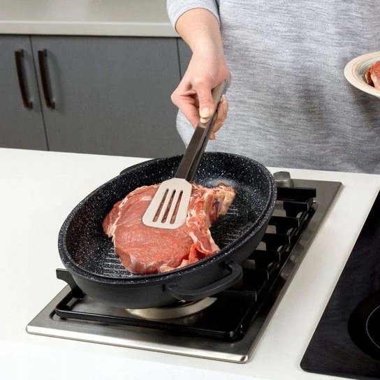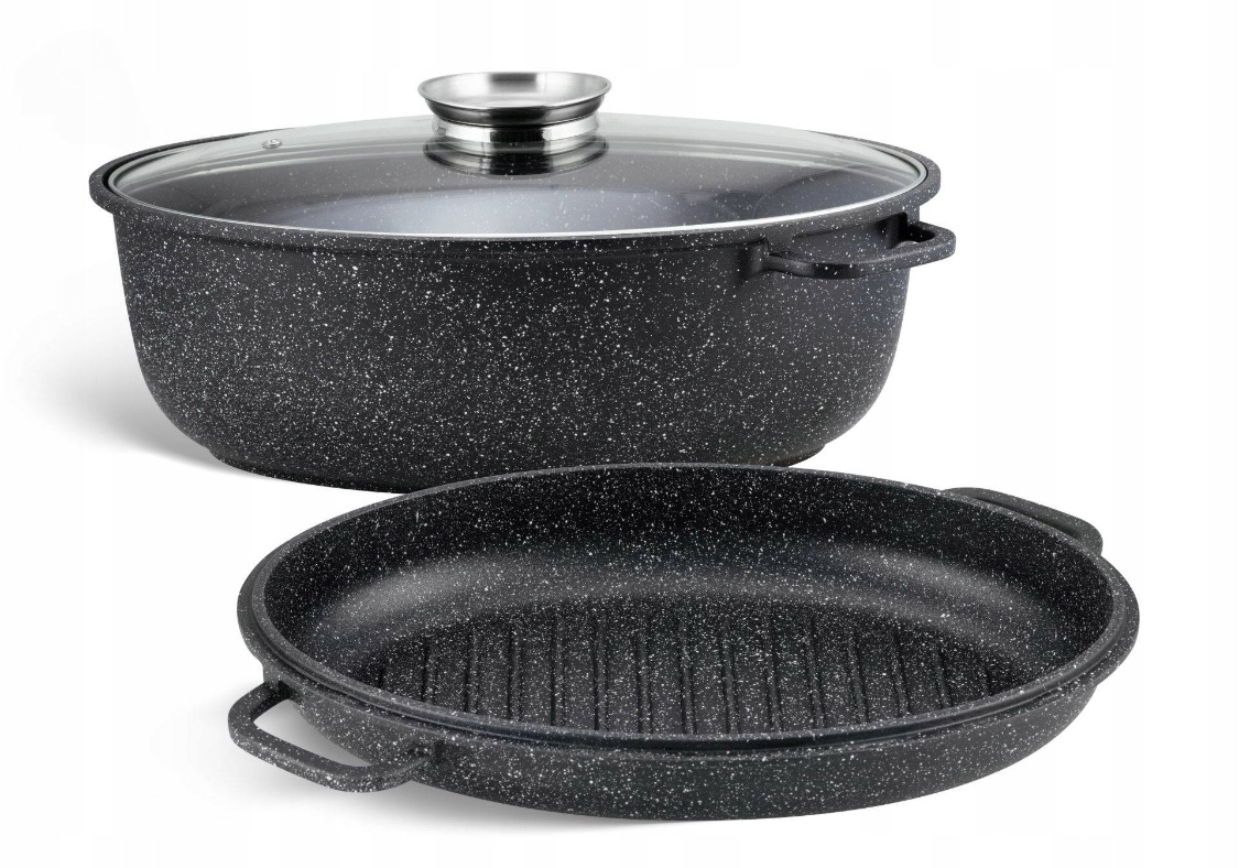 Размеры: 38x26x13 см. Емкость 8,0 л. Крышка из того же материала, что и жаровня. Это дает мне дополнительные преимущества. Крышка никогда не разобьется, как стеклянные, а во-вторых, на ней также можно жарить или запекать. В комплект также входит стеклянная крышка.