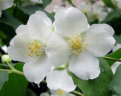 Они появляются очень обильно в конце мая – июле. Они довольно крупные, чисто-белые, собраны в грозди по 5-7 штук. Они характеризуются чрезвычайно приятным ароматом.