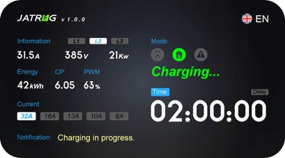 [Функции кнопок] Токи: 16a, 13a, 10a, 8a, адаптированные к различным уровням мощности. Выбранный ток будет автоматически сохранен, поэтому вам не придется устанавливать его снова при следующем старте. Нажав кнопку таймера, вы можете выбрать задержку запуска между 0H и 12H, идеально перемещая пиковой период потребления электроэнергии.