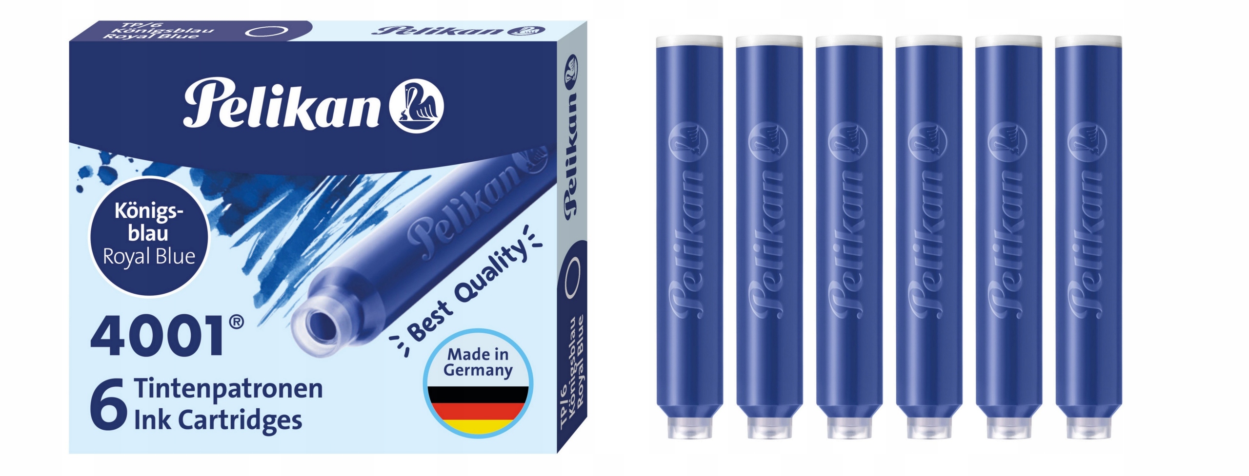 Каждая ручка комплектуется одним синим стартовым картриджем (классическая, самая популярная форма на рынке) + короткими картриджами Pelikan 1 упаковка (6 шт.) и соответствующим поршнем.