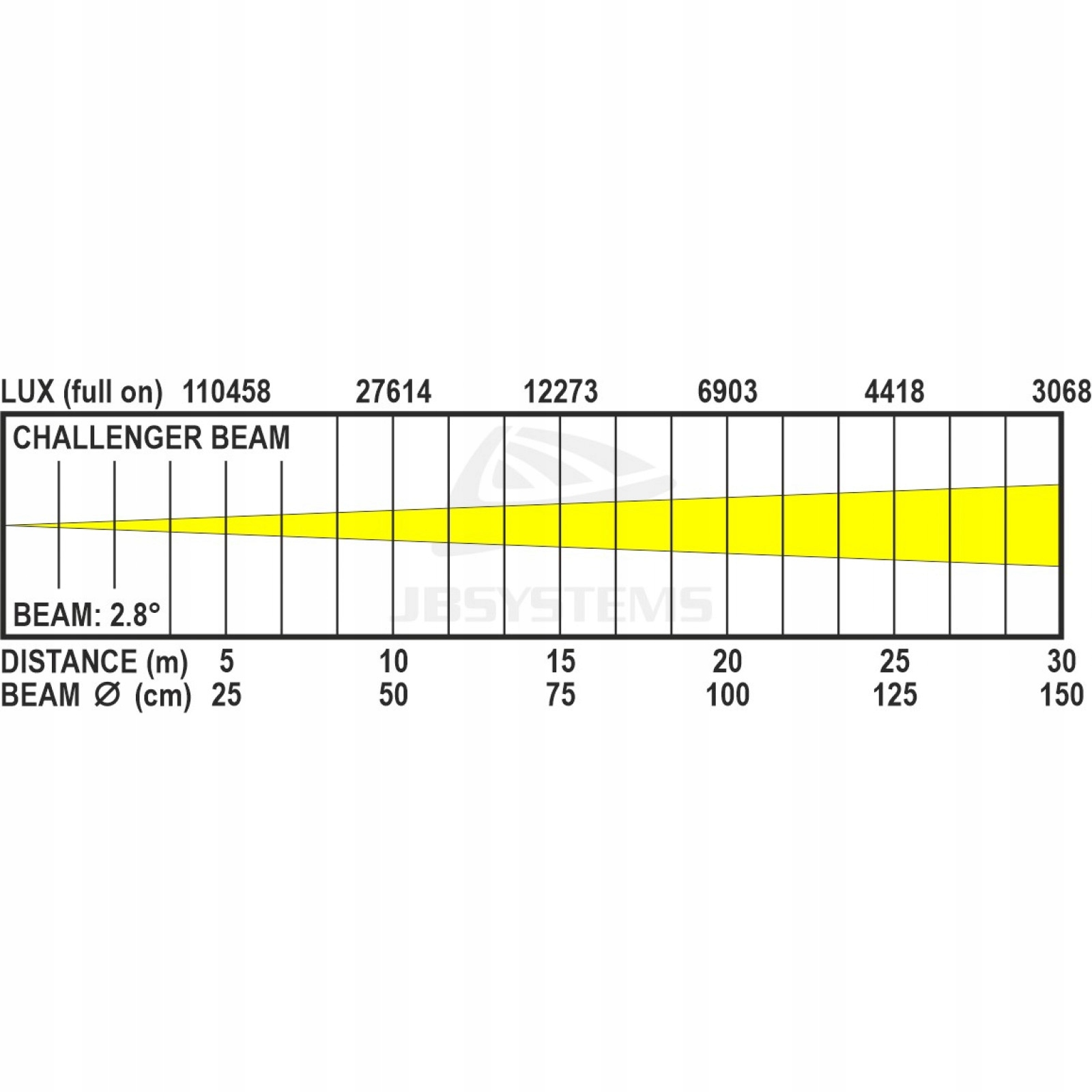 Луч оснащен очень сильным и эффективным белым диодом мощностью 200 Вт и оптикой высшего класса, генерирующей сфокусированный луч с углом 2,8°. Острый и сильный световой луч 2,8° позволяет устройству достигать интенсивности 110'500 люкс на расстоянии 5 м!!!