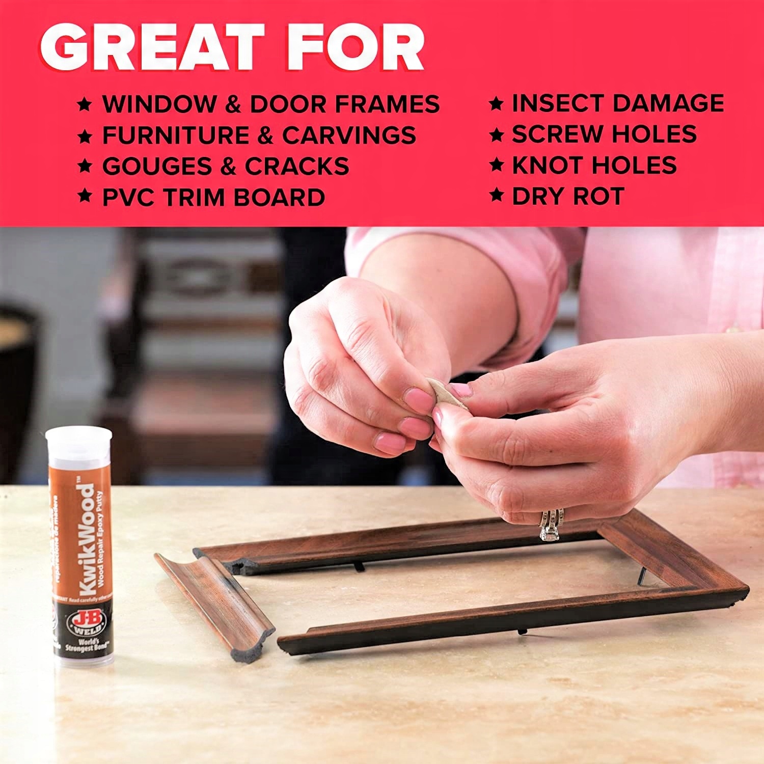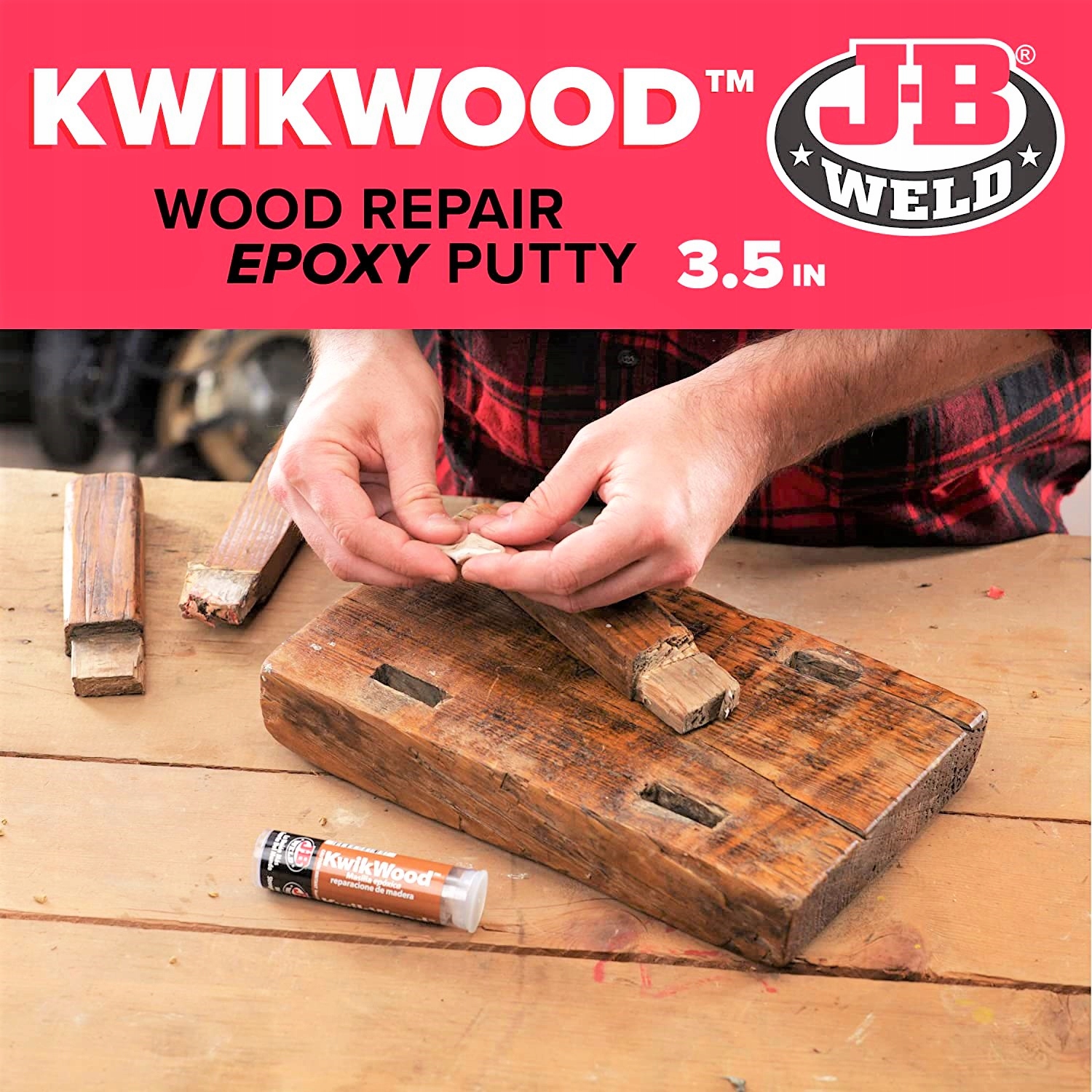 JB Weld KwikWood придает любой поврежденной деревянной поверхности почти такой же вид. хорошо, как новый!
