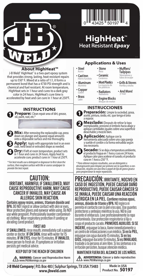 J-B Weld HighHeat — это двухкомпонентная эпоксидная система, обеспечивающая прочный, долговечный и термостойкий ремонт при температуре до 232°C. Смешанный в соотношении 1:1, он создает прочное соединение с прочностью 4730 фунтов на квадратный дюйм и устойчив к химическим веществам и топливу. При комнатной температуре HighHeat затвердевает за 1 час и затвердевает за 24 часа. Время отверждения HighHeat можно ускорить за счет нагрева (например, 1 час отверждения при 120°C).
