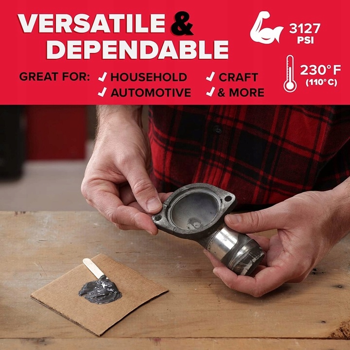 J-B Weld — это двухкомпонентная эпоксидная система, обеспечивающая прочный и долговечный ремонт практически на любой поверхности. Две части смешиваются в соотношении 1:1, после затвердевания они образуют прочное соединение с пределом прочности 5020 PSI. J-B Weld затвердевает через 4–6 часов до темно-серого цвета и полностью затвердевает через 15–24 часа.