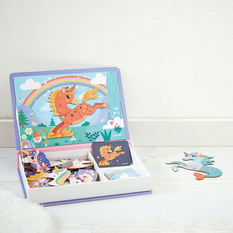 Магнитная книга Единорог из самой продаваемой линии магнитных книг французского бренда Janod содержит: