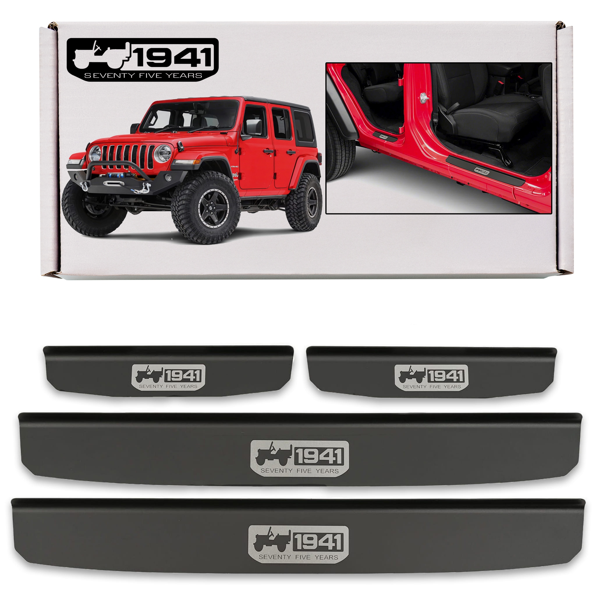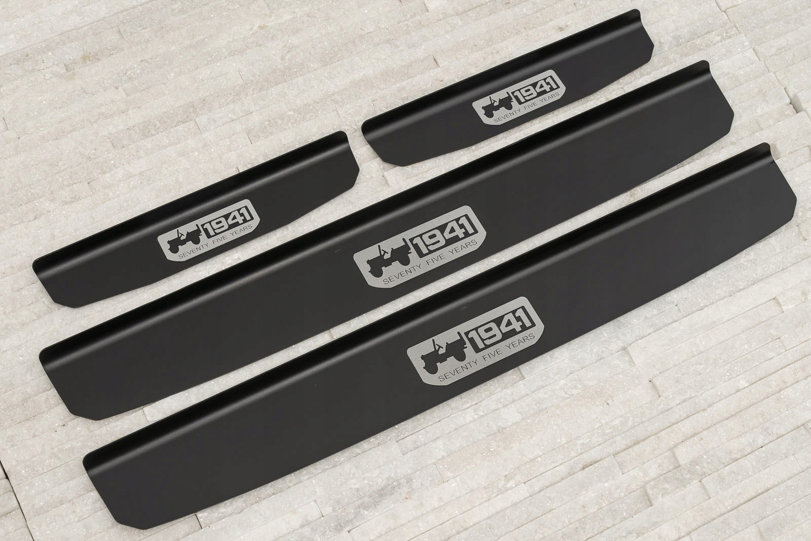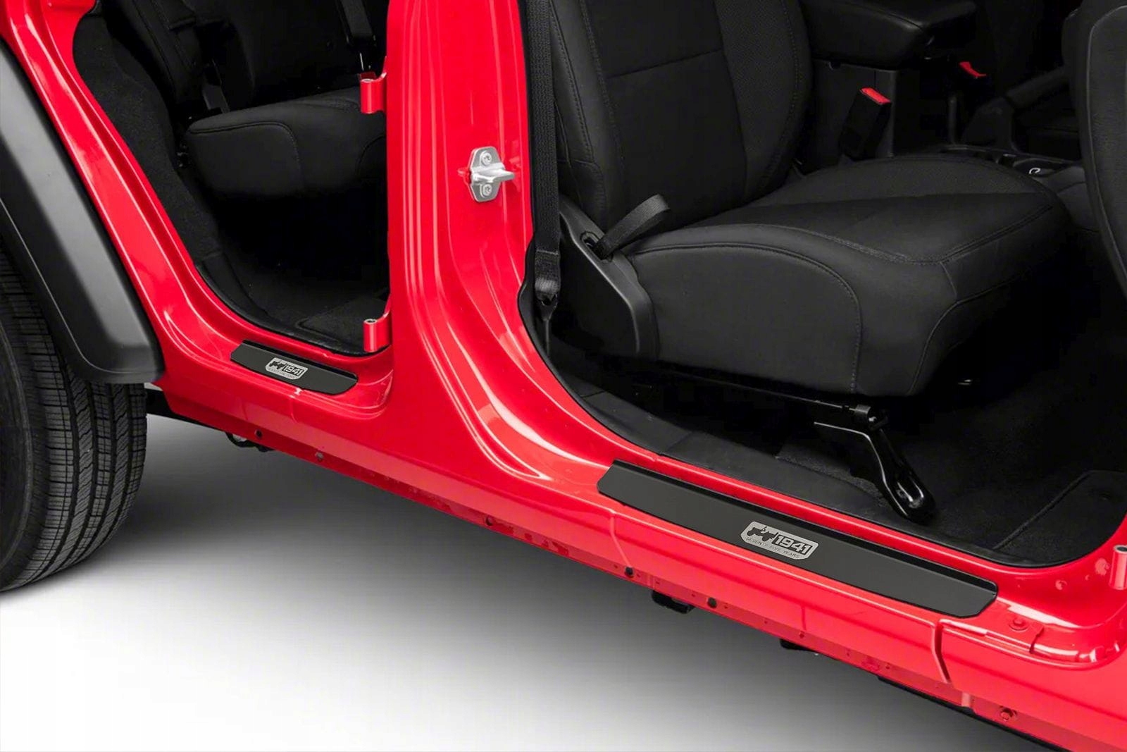 Полоски крепятся на окрашенные части внутренних порогов. Они дополняют внутреннюю линию дверей и придают зоне подоконников спортивный акцент. Принт на полосках отмечает год основания бренда и отсылает к стилю американского военного внедорожника Willys MB, давшего начало модели Wrangler. Помимо своей дизайнерской ценности, полоски играют защитную роль, защищая дверные пороги от царапин и повреждений, которые могут возникнуть при посадке и выходе из автомобиля.