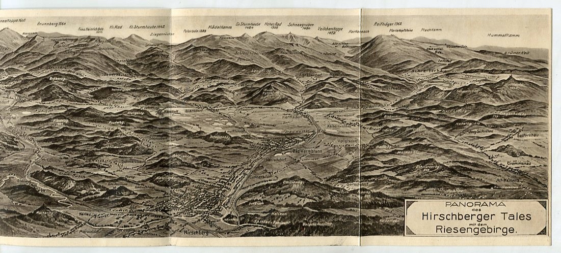PANORAMA des HIRSCHBERGER TALES mit dem RIESENGEBIRGE ::: старая, оригинальная, довоенная панорама долины Еленя-Гура и Крконоше, сложенная, чистая на обороте (не распечатанная)