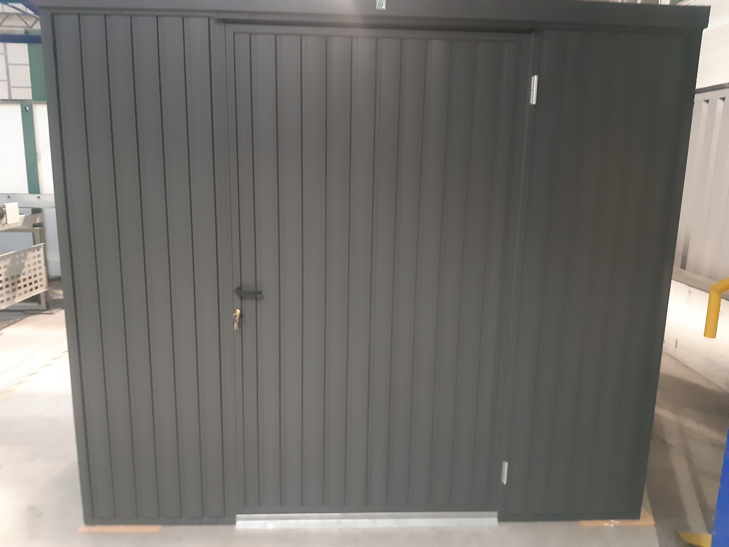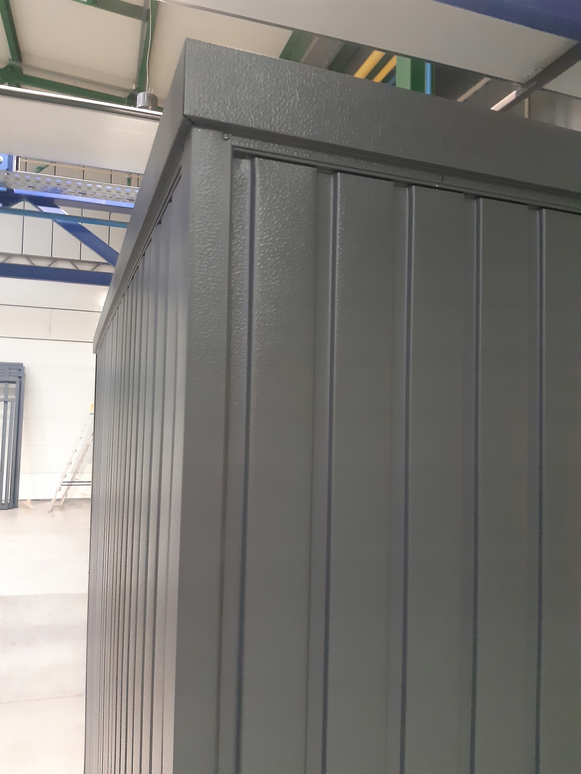 Это дом, вся каркасная конструкция которого выполнена из закрытой оцинкованные стальные секции, вырезанные лазером и соединенные роботизированной сваркой. {Что значительно повышает жесткость конструкции, чем в случае с традиционно используемой угловой конструкцией}. Заполнение представляет собой профилированный оцинкованный трапециевидный лист Т-10, вертикально расположенный на стенах и дверях, с порошковым покрытием, включая всю конструкцию рамы, в цвет Ral: 7024 - Графит или Ral: 8028 - Коричневый. Обшивка из листового металла крепится к конструкции с помощью современной сварочной технологии перед порошковой покраской, благодаря чему мы избегаем традиционной клепки, что значительно повышает качество и эстетику изготовления. Трапециевидный лист крыши Т-10 крепится саморезами с резиновой прокладкой. Вещевой отсек выполнен очень добротно и эстетично, имеет набор угловых и потолочных отливов. Надежное качество изготовления обеспечивает не только долгий срок службы, но и привлекательный внешний вид.