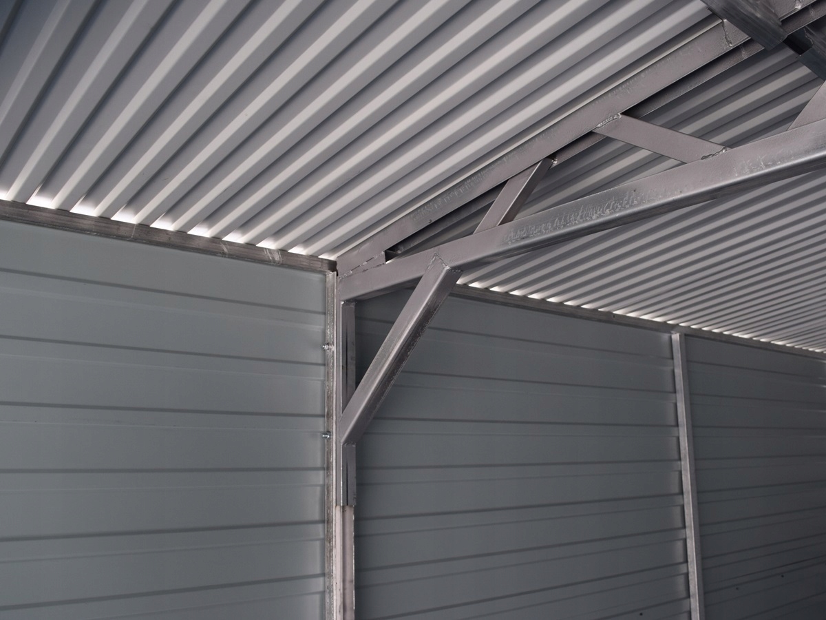 Гараж из листового металла шириной 6,00 м (5,97 м) и Длина 5,00 м (4,97 м). 2 подъемно-поворотные ворота с ГОРИЗОНТАЛЬНЫМ тиснением из листового металла (ширина тиснения около 20 см). Высота входа 1,94 м. Двухскатная крыша, общая высота вверху 2,65 м, высота боковых стен 2,13 м. Акриловый лист - под дерево: стены, отливы и желоба RAL7016 - цвет ТЕМНЫЙ ГРАФИТ, ворота RAL9006 - цвет СЕРЕБРЯНЫЙ, а крыша BTX8017 темная. коричневый матовый. Листовой металл крепится к конструкции с помощью заклепок, соответствующих цвету листового металла. Конструкция стены усилена оцинкованными закрытыми профилями 30х30. ОТЛИЧИКИ И ЖЕЛОБЫ ИЗ ЛИСТОВОГО МЕТАЛЛА темно-графитового цвета RAL7016. Стены из листового металла Т-7 в ГОРИЗОНТАЛЬНОМ расположении.