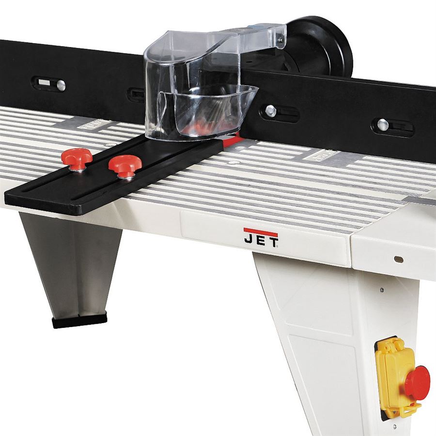 Удлинение стола создает большую опору (1030 мм) для заготовки. Стол JRT-1 поставляется со вставкой стола, угловым упором, фрезерным упором и прозрачной крышкой фрезы.